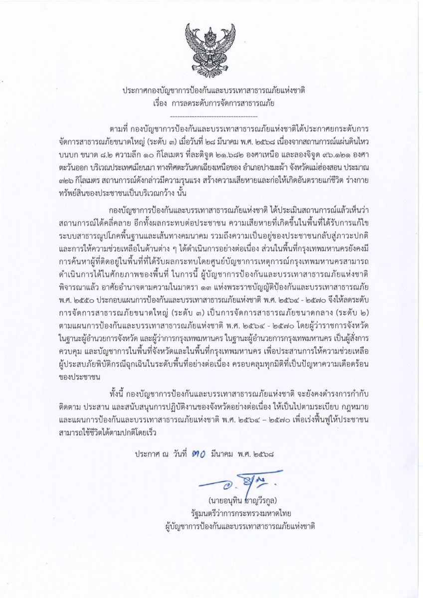 บกปภ.ช. ประกาศ ลดระดับการจัดการสาธารณภัย เป็นระดับ 2 (สาธารณภัยขนาดกลาง) กรณีเหตุแผ่นดินไหว ให้จังหวัดและกรุงเทพมหานครควบคุมและบัญชาการในพื้นที่ เพื่อช่วยเหลือและเยียวยาผู้ประสบภัยอย่างเต็มกำลัง