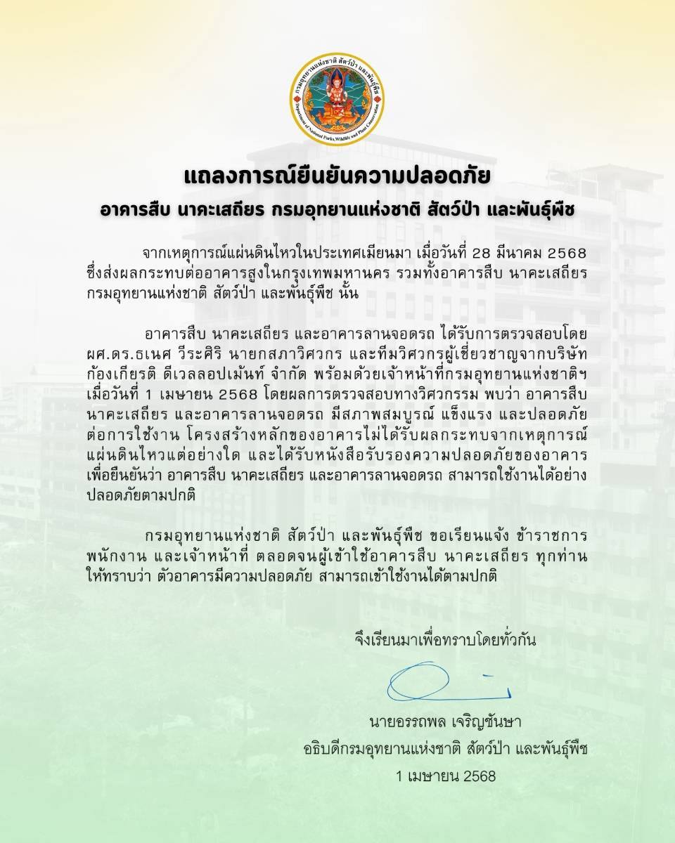 จากเหตุการณ์แผ่นดินไหวในประเทศเมียนมา เมื่อวันที่ 28 มีนาคม 2568 ซึ่งส่งผลกระทบต่ออาคารสูงในกรุงเทพมหานคร รวมทั้งอาคารสืบ นาคะเสถียร กรมอุทยานแห่งชาติ สัตว์ป่า และพันธุ์พืช นั้น
