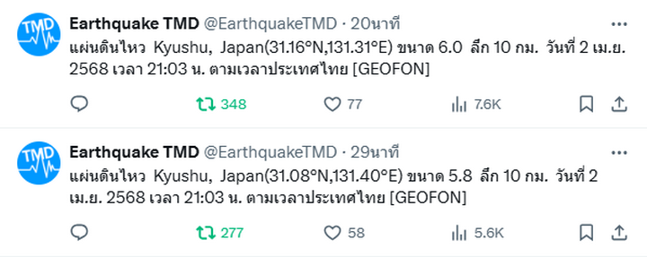 2 เมษายน 2568 มีรายงานผ่านทาง X @EarthquakeTMD กองเฝ้าระวังแผ่นดินไหว กรมอุตุนิยมวิทยา เกิดแผ่นดินไหว Kyushu, Japan (31.16°N,131.31°E) ขนาด 6.0 ลึก 10 กม. เวลา 21:03 น. ตามเวลาประเทศไทย ทำให้รับรู้แรงสั่นสะเทือนได้ทั้ง คิวชู เบื้องต้นไม่มีรายงานความเสียหาย และการเตือนสึนามิ