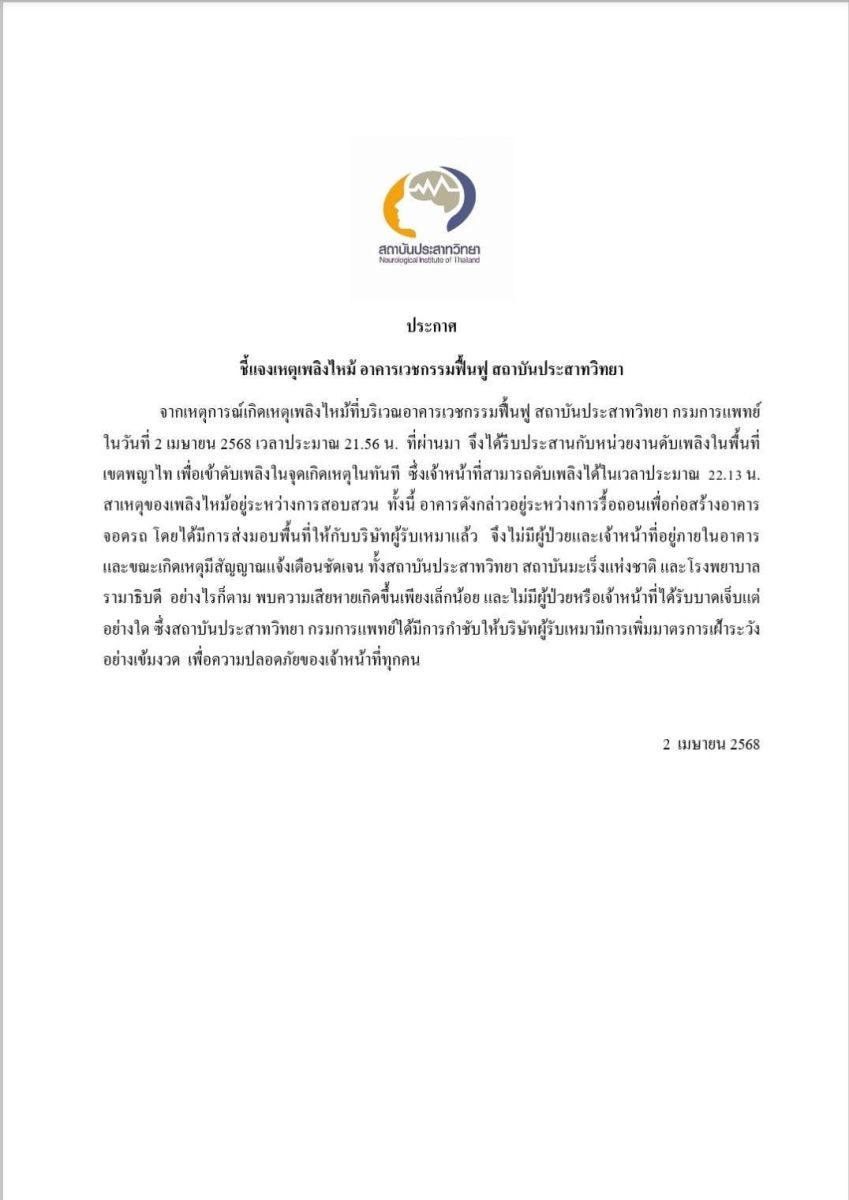 จากเหตุการณ์เกิดเหตุเพลิงไหม้ที่บริเวณอาคารเวชกรรมฟื้นฟู สถาบันประสาทวิทยา กรมการแพทย์ ในวันที่ 2 เมษายน 2568 เวลาประมาณ 21.56 น. ที่ผ่านมา จึงได้รีบประสานกับหน่วยงานดับเพลิงในพื้นที่เขตพญาไท เพื่อเข้าดับเพลิงในจุดเกิดเหตุในทันที ซึ่งเจ้าหน้าที่สามารถดับเพลิงได้ในเวลาประมาณ 22.13 น. สาเหตุของเพลิงไหม้อยู่ระหว่างการสอบสวน