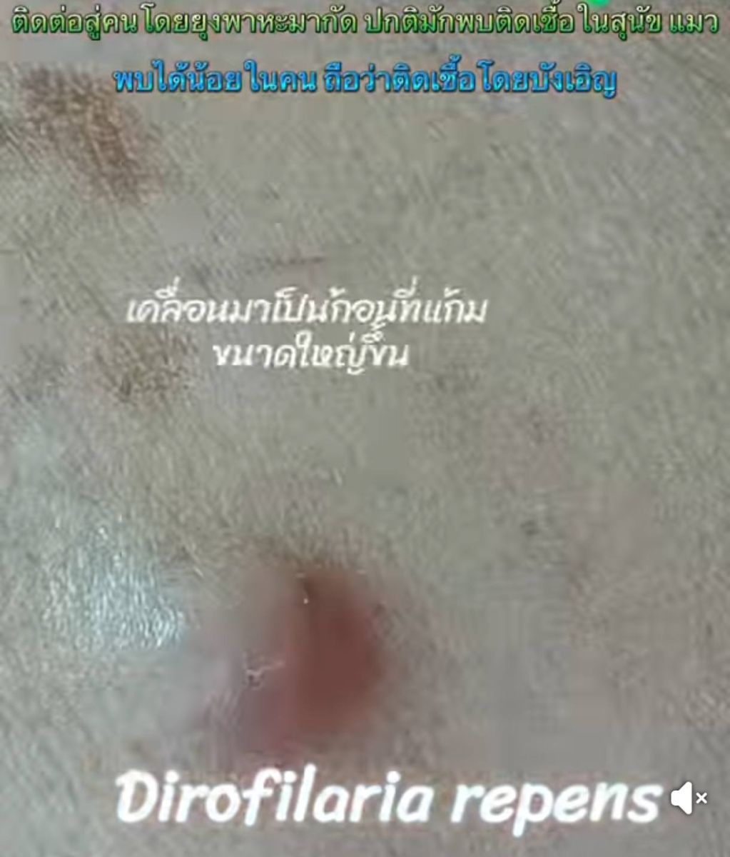 ล่าสุดผู้ป่วยคนดังกล่าวได้ส่งคลิปวิดีโอมาให้ตรวจสอบ ด้วยความตกใจ นอกจากบริเวณก้อนเนื้อได้มีแผลปูดออกมา จากนั้นมีตัวพยาธิออกมาด้วย ผู้ป่วยจึงดึงออกมาดูมีความยาวประมาณ 5 เซนติเมตร มีลักษณะเป็นเส้นใสสีขาว จึงได้ถ่ายคลิปแล้วส่งให้ตรวจสอบ จากการตรวจสอบพบเป็นพยาธิกลุ่มเดียวกันกับพยาธิหนอนหัวใจสุนัข หรือ Dirofilaria repens เป็นพยาธิตัวกลมที่พบในสุนัข แมว และสัตว์ป่าในยุโรป เอเชีย และแอฟริกา ยุงเป็นพาหะนำเชื้อสู่มนุษย์ ซึ่งเป็นโฮสต์โดยบังเอิญ พยาธิชนิดนี้ไม่สามารถเจริญเติบโตเต็มวัยในร่างกายมนุษย์ แต่สามารถทำให้เกิด Dirofilariasis หรือเรียกว่าโรค Dirofilariasis ในคนที่เลี้ยงหมาแมวต้องระวัง ซึ่งแสดงอาการเป็นก้อนใต้ผิวหนังหรือก้อนในดวงตา การติดเชื้อในมนุษย์มักพบเป็นก้อนเคลื่อนที่ใต้ผิวหนัง (Subcutaneous Nodule) หรือก้อนพยาธิในตา (Ocular Dirofilariasis) อาการอาจรวมถึงอาการคัน ตาแดง ระคายเคือง หรือบวมบริเวณที่ติดเชื้อ การวินิจฉัยทำได้โดยตรวจชิ้นเนื้อหรืออัลตราซาวด์ สำหรับการรักษาหลักคือการผ่าตัดนำก้อนพยาธิออก การป้องกันเน้นการควบคุมยุงและให้สัตว์เลี้ยงกินยาป้องกันพยาธิหนอนหัวใจเป็นประจำ