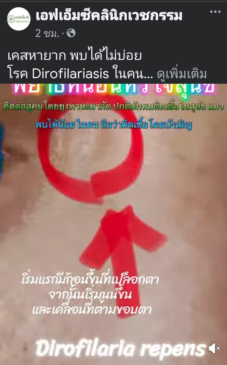 4 เมษายน 2568 โลกออนไลน์แชร์ผู้คลิปวิดีโอพยาธิชนิดหนึ่ง มีลักษณะเป็นเส้น มีสีขาวใส ความยาวประมาณ 5 ซม. ขยับตัวอยู่บนกระดาษชำระ ทราบว่าออกมาจากบริเวณใต้ขอบตาของผู้ป่วยรายหนึ่งใน จ.ระยอง ที่ได้ส่งคลิปมาปรึกษากับแพทย์ผู้เชี่ยวชาญที่ จ.นครราชสีมา ช่วยตรวจสอบ ที่เอฟเอ็มซีคลินิกเวชกรรมเพื่อไปสอบถามถึงคลิปเหตุการณ์ดังกล่าว