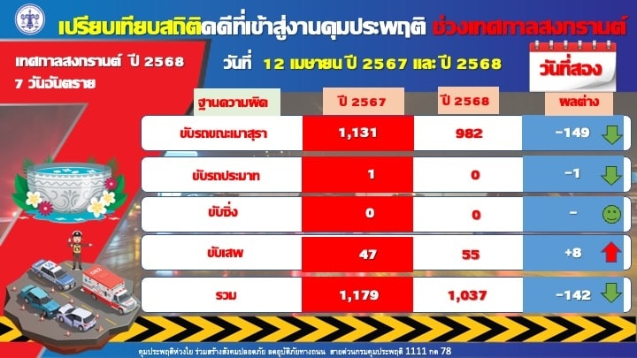 เมื่อเปรียบเทียบกับวันเดียวกันของปี 2567 ซึ่งมีคดีขับรถขณะเมาสุราจำนวน 1,131 คดี พบว่าในปี 2568 มีจำนวน 982 คดี ลดลง 149 คดี