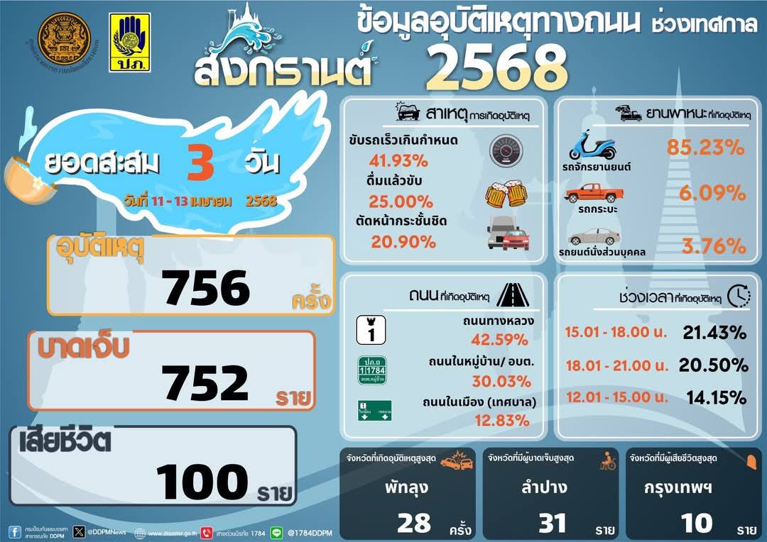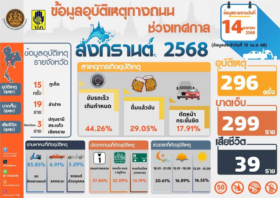 สำหรับข้อมูลอุบัติเหตุทางถนนช่วงเทศกาลสงกรานต์ พ.ศ. 2568 ประจำวันที่ 13 เมษายน 2568 ซึ่งเป็นวันที่สามของการรณรงค์ “ขับขี่ปลอดภัย เมืองไทยไร้อุบัติเหตุ” ศูนย์อำนวยการป้องกันและลดอุบัติเหตุทางถนนช่วงเทศกาลสงกรานต์ พ.ศ. 2568 โดยกรมป้องกันและบรรเทาสาธารณภัยและความร่วมมือของหน่วยงานภาคีเครือข่ายได้รวบรวมสถิติอุบัติเหตุทางถนนประจำวันที่ 13 เมษายน 2568 เกิดอุบัติเหตุ 296 ครั้ง ผู้บาดเจ็บ 299 คน ผู้เสียชีวิต 39 ราย สาเหตุที่ทำให้เกิดอุบัติเหตุสูงสุด ได้แก่ ขับรถเร็ว ร้อยละ 44.26 ดื่มแล้วขับ 29.05 และตัดหน้ากระชั้นชิด 17.91 ยานพาหนะที่เกิดอุบัติเหตุสูงสุด ได้แก่ รถจักรยานยนต์ ร้อยละ 85.85 ส่วนใหญ่เกิดบนเส้นทางตรง ร้อยละ 81.42 ถนนกรมทางหลวง ร้อยละ 37.84 ถนนใน อบต./หมู่บ้าน ร้อยละ 32.09 ถนนในเมือง (เทศบาล) ร้อยละ 14.19 ช่วงเวลาที่เกิดอุบัติเหตุสูงสุด ได้แก่ เวลา 18.01 – 21.00 น. ร้อยละ 20.61 เวลา 15.01- 18.00 น. ร้อยละ 16.89 และเวลา 12.01 – 15.00 น. ร้อยละ 16.55 ผู้บาดเจ็บและเสียชีวิตสูงสุดอยู่ในช่วงอายุ 20-29 ปี ร้อยละ 21.89 จัดตั้งจุดตรวจหลัก 1,754 จุด เจ้าหน้าที่ปฏิบัติงาน 51,017 คน โดยจังหวัดที่เกิดอุบัติเหตุสูงสุด ได้แก่ ภูเก็ต (15 ครั้ง) จังหวัดที่มีผู้บาดเจ็บสูงสุด ได้แก่ ลำปาง (19 คน) จังหวัดที่มีผู้เสียชีวิตสูงสุด ได้แก่ ปทุมธานี สระแก้ว และเชียงราย (จังหวัดละ 3 ราย)