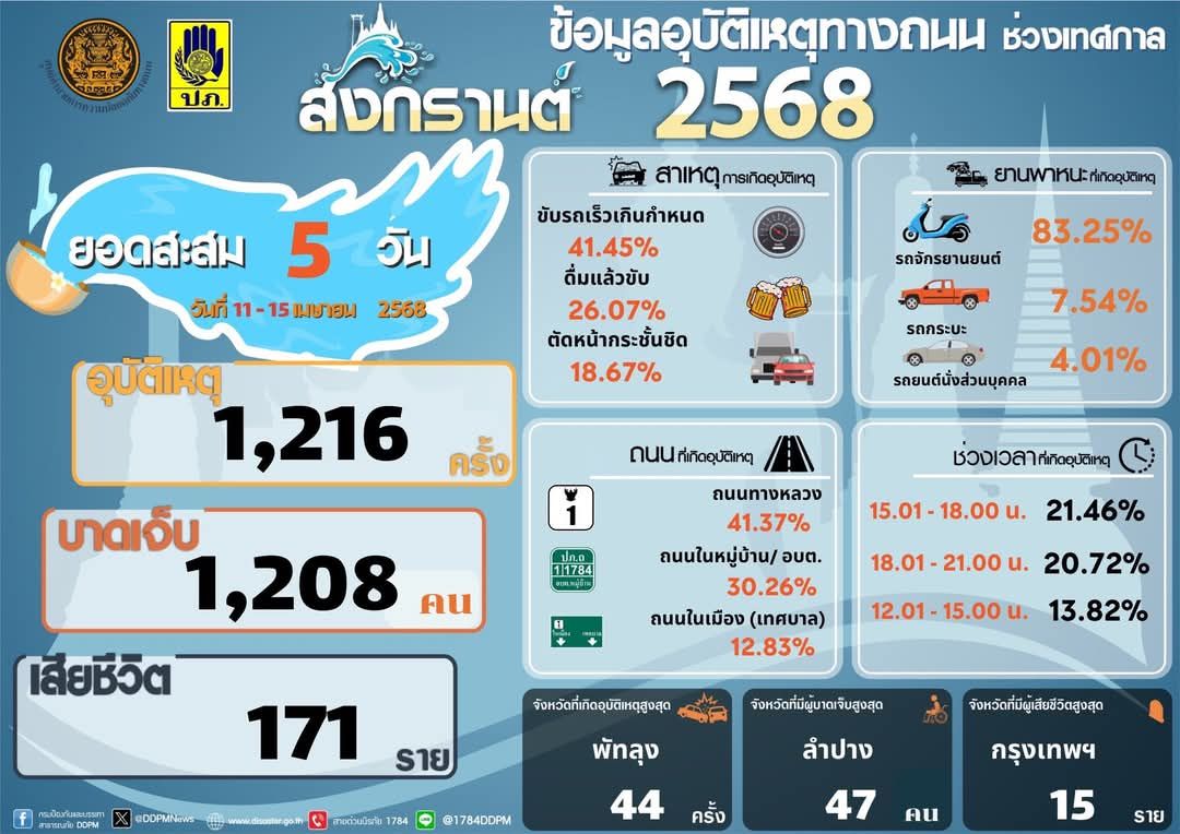 สำหรับข้อมูลอุบัติเหตุทางถนนช่วงเทศกาลสงกรานต์ พ.ศ. 2568 ประจำวันที่ 15 เมษายน 2568 ซึ่งเป็นวันที่ห้าการรณรงค์ “ขับขี่ปลอดภัย เมืองไทยไร้อุบัติเหตุ” ศูนย์อำนวยการป้องกันและลดอุบัติเหตุทางถนนช่วงเทศกาลสงกรานต์ พ.ศ. 2568 โดยกรมป้องกันและบรรเทาสาธารณภัยและความร่วมมือของหน่วยงานภาคีเครือข่ายได้รวบรวมสถิติอุบัติเหตุทางถนนประจำวันที่ 15 เมษายน 2568 เกิดอุบัติเหตุ 214 ครั้ง ผู้บาดเจ็บ 209 คน ผู้เสียชีวิต 27 ราย สาเหตุที่ทำให้เกิดอุบัติเหตุสูงสุด ได้แก่ ขับรถเร็ว ร้อยละ 36.92 ดื่มแล้วขับ 31.31 และทัศนวิสัยไม่ดี ร้อยละ 20.09 ยานพาหนะที่เกิดอุบัติเหตุสูงสุด ได้แก่ รถจักรยานยนต์ ร้อยละ 85.32 ส่วนใหญ่เกิดบนเส้นทางตรง ร้อยละ 87.38 ถนนกรมทางหลวง ร้อยละ 36.45 ถนนในอบต./หมู่บ้าน ร้อยละ 33.18 ถนนกรมทางหลวงชนบท ร้อยละ 14.95 ช่วงเวลาที่เกิดอุบัติเหตุสูงสุด ได้แก่ เวลา 18.01 -21.00 น. ร้อยละ 22.90 เวลา 15.01 – 18.00 น. ร้อยละ 20.56 และเวลา 00.01 – 03.00 น. ร้อยละ 13.55 ผู้บาดเจ็บและเสียชีวิตสูงสุดอยู่ในช่วงอายุ 20-29 ปี ร้อยละ 20.34 จัดตั้งจุดตรวจหลัก 1,764 จุด เจ้าหน้าที่ปฏิบัติงาน 51,039 คน โดยจังหวัดที่เกิดอุบัติเหตุสูงสุด ได้แก่ ประจวบคีรีขันธ์ (10 ครั้ง) จังหวัดที่มีผู้บาดเจ็บสูงสุด ได้แก่ ประจวบคีรีขันธ์ (13 คน) จังหวัดที่มีผู้เสียชีวิตสูงสุด ได้แก่ พิษณุโลก (3 ราย)