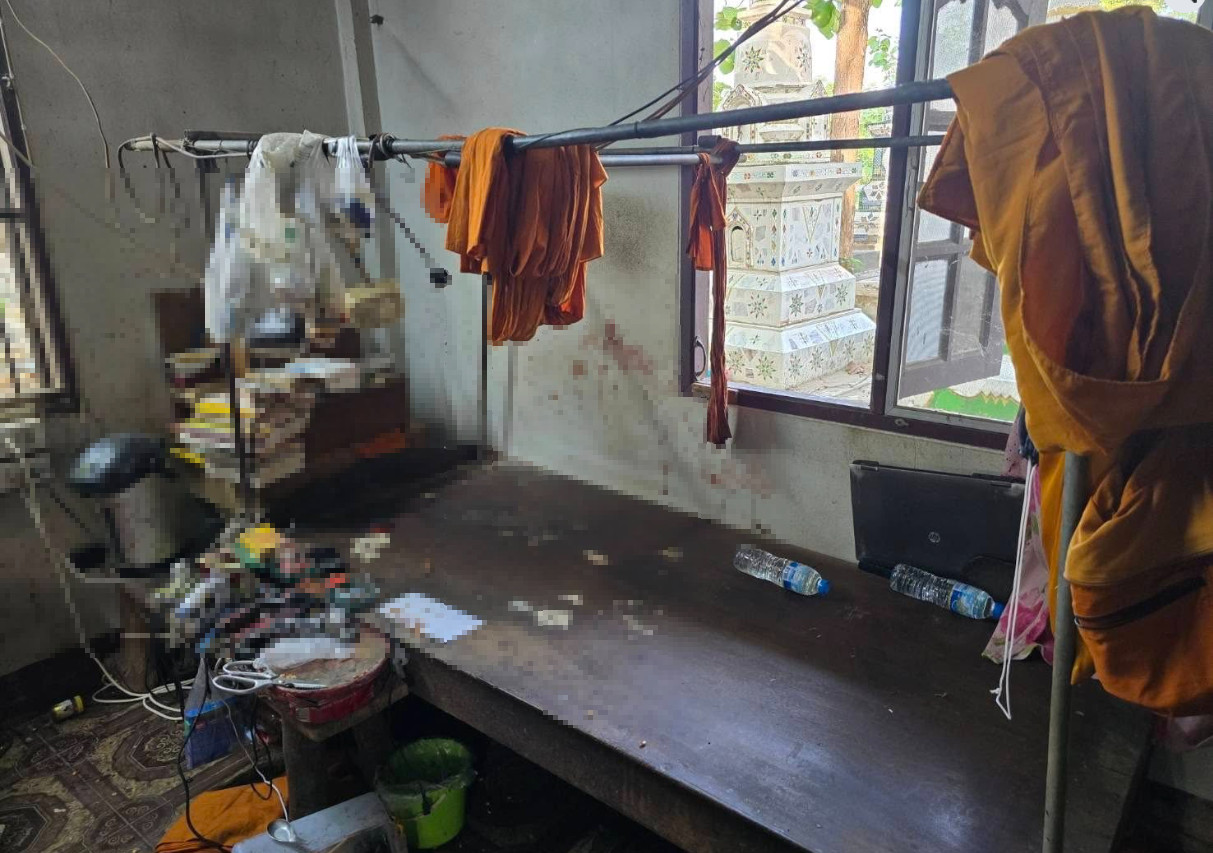 ที่เกิดเหตุภายในกุฏิพบพระอายุ 70 ปี เป็นพระลูกวัด นอนอยู่บนที่นอน มีร่องรอยถูกไฟไหม้ตามลำตัวมากกว่า 50 เปอร์เซ็นต์ ตรวจสอบอย่างละเอียดพบว่าตามใบหน้า ,ลำตัว และแขนมีร่องรอยของมีคม หน่วยกู้ชีพรีบนำตัวส่งโรงพยาบาลเพราะอาการสาหัส ส่วนผู้ก่อเหตุคาดเป็นสาวสอง คนในหมู่บ้าน เพราะได้หลบหนีออกจากบ้าน