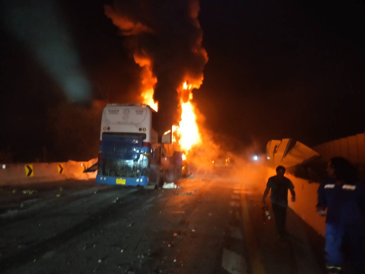อุบัติเหตุครั้งนี้เกิดขึ้นเมื่อเวลาประมาณ 01.40 น. ของวันที่ 21 เมษายน 2568 เมื่อรถโดยสารประจำทางหมายเลขทะเบียน 10-7125 ของบริษัท 407 พัฒนา เส้นทางหนองคาย - อุดรธานี - ระยอง ออกเดินทางจากจังหวัดหนองคาย เมื่อเวลา 15.30 น. มุ่งหน้าส่งผู้โดยสารปลายทางที่จังหวัดตราด เมื่อมาถึงจุดเกิดเหตุ ทางลงเขา เกิดลมเบรกหมด ผู้ขับความคุมรถไม่ได้ จึงเสียหลักพุ่งชนท้ายรถบรรทุกบริเวณเขาศาลปู่โทน กม. 208+600 ถนนสาย 304 ต.บุพราหมณ์ อ.นาดี จ.ปราจีนบุรี ทำให้เกิดเพลิงลุกไหม้ช่วงหน้าของรถบัสโดยสาร มีผู้เสียชีวิต จำนวน 7 ราย และผู้ได้รับบาดเจ็บ รวมจำนวน 53 ราย รักษาตัวอยู่ที่ โรงพยาบาลเกษมราฏร์ 1 ราย โรงพยาบาลกบินทร์บุรี 13 ราย และโรงพยาบาลนาดี 39 ราย ผู้ว่าราชการจังหวัดปราจีนบุรี ได้แสดงความเสียใจต่อครอบครัวของผู้เสียชีวิตและผู้บาดเจ็บที่โรงพยาบาลนาดี พร้อมทั้งเน้นย้ำถึงความสำคัญของการตรวจสอบสภาพรถและระบบเบรกก่อนการเดินทาง รวมถึงความสำคัญของการจอดลงเวลาที่จุดพักรถ ซึ่งเป็นโอกาสให้ได้พักรถและพักคน เพื่อป้องกันการเกิดอุบัติเหตุที่อาจเกิดขึ้น