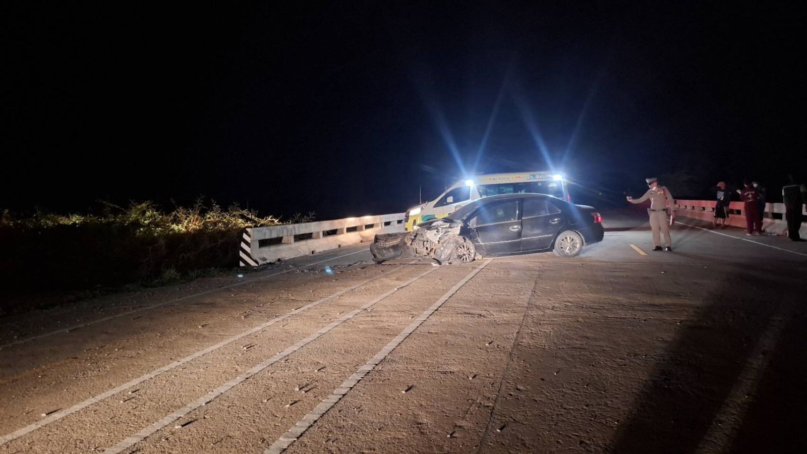 รถนั่งส่วนบุคคลเสียหลักชนราวสะพาน ถนนสายบ้านบึงราชนกเชื่อมต่อกับบ้านแหลมไผ่ มีผู้เสียชีวิต จ.พิษณุโลก