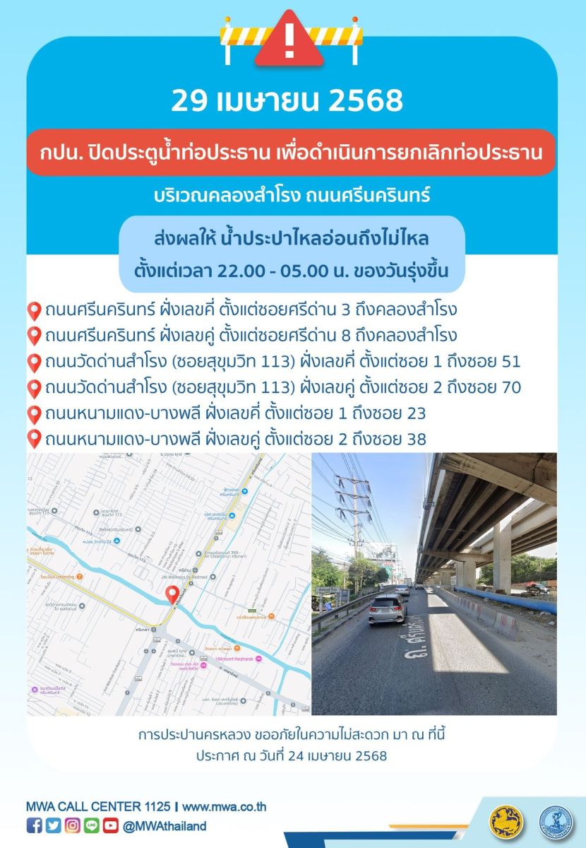 การประปานครหลวง (กปน.) มีความจำเป็นต้องปิดประตูน้ำท่อประธานขนาดเส้นผ่านศูนย์กลาง 800 มิลลิเมตร เพื่อดำเนินการยกเลิกท่อประธาน บริเวณคลองสำโรง ถนนศรีนครินทร์ ในคืนวันอังคารที่ 29 เมษายน 2568 ตั้งแต่เวลา 22.00 - 05.00 น. ของวันรุ่งขึ้น เพื่อให้ประชาชนได้รับบริการน้ำประปาอย่างเพียงพอและทั่วถึง โดยระหว่างดำเนินการ ส่งผลให้ น้ำประปาไหลอ่อนถึงไม่ไหล ในพื้นที่ดังต่อไปนี้