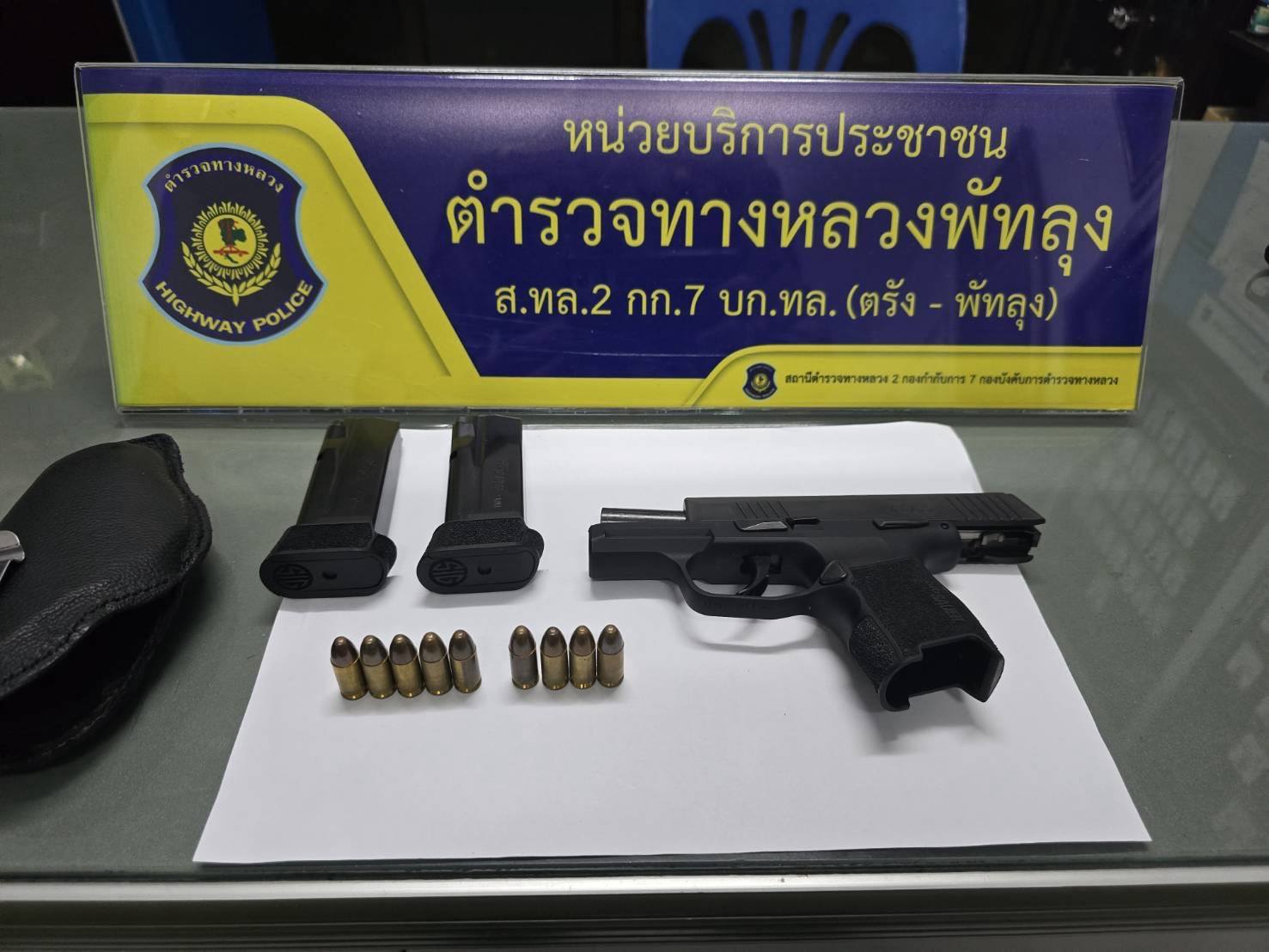 พร้อมยึดของกลาง อาวุธปืนพกสั้น ชนิดกึ่งอัตโนมัติ ขนาด 9 มม. จำนวน 1 กระบอก, เครื่องกระสุนปืนขนาด 9 มม. รวมทั้งหมด จำนวน 9 นัด โดยจับกุมได้บริเวณด่านตรวจ ถนนทางหลวงหมายเลข 4 กม.1151-1152 อ.ศรีนครินทร์ จ.พัทลุง