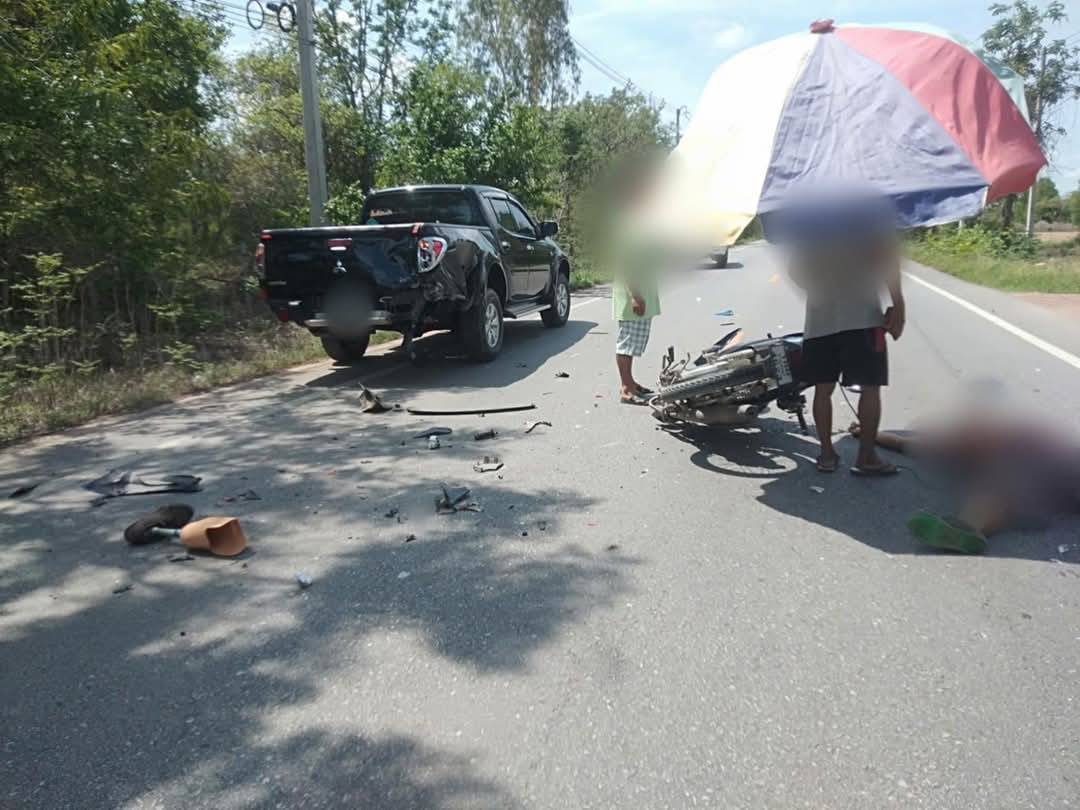 รถจักรยานยนต์ชนกับรถกระบะ ผู้บาดเจ็บอาการสาหัส อาสากู้ชีพ-กู้ภัยช่วยเหลือปั๊มหัวใจแต่ไม่เป็นผล จ.กาญจนบุรี