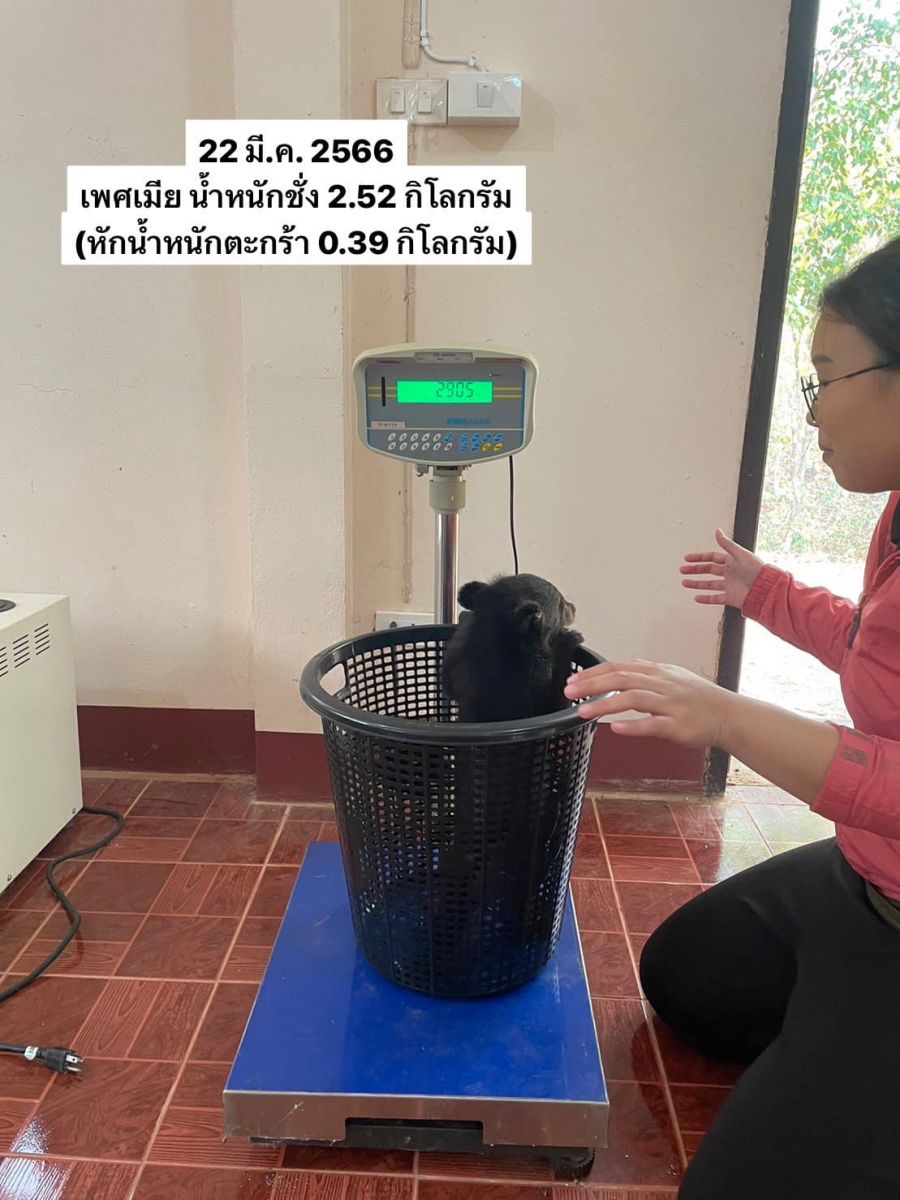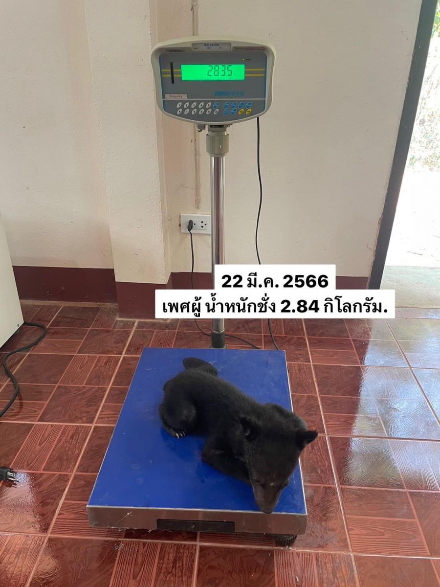 สถานีเพาะเลียงสัตว์ป่าปางตอง รายงานความคืบหน้าการดูแลลูกหมีควายสัตว์ป่าของกลางว่า หลังจากได้รับดูแลอนุบาลลูกหมีควาย 2 ตัว เพศผู้ และเพศเมีย ตั้งแต่วันที่ 7 มีนาคม 2566 (สัตว์ป่าของกลาง) จนถึงวันนี้รวม 16 วัน เจ้าหน้าที่ได้ทำการชั่งน้ำหนักลูกหมีทั้ง 2 ตัว ดังนี้ ลูกหมีควาย เพศผู้ น้ำหนักชั่ง 2.84 กิโลกรัม (น้ำหนักแรกรับ 1.85 กิโลกรัม) น้ำหนักขึ้นประมาณ 1 กิโลกรัม และลูกหมีควาย เพศเมีย น้ำหนักชั่ง 2.52 กิโลกรัม (น้ำหนักแรกรับ 1.57 กิโลกรัม) น้ำหนักขึ้นประมาณ 900 กรัม