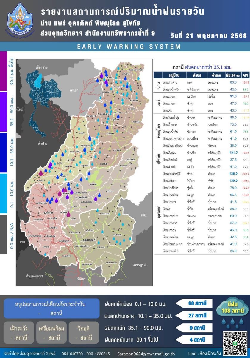 • เวลา 10:50 น. แจ้งเตือนภัยระดับวิกฤติ (สีแดง) ในพื้นที่บ้านปางส้าน ตำบลยอด อำเภอสองแคว จากปริมาณฝนสะสมในรอบ 12 ชั่วโมงถึง 154 มิลลิเมตร