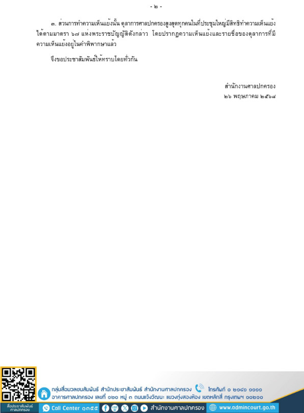 2. คดีนี้ศาลปกครองสูงสุดนั่งพิจารณาคดี เมื่อวันที่ 12 กันยายน 2566 โดยตุลาการศาลปกครองสูงสุด ที่นั่งพิจารณาได้ลงลายมือชื่อในร่างคำพิพากษาครบทั้งห้าคนเรียบร้อยแล้ว ต่อมาประธานศาลปกครองสูงสุด ได้มีคำสั่งให้นำคดีเข้าสู่การพิจารณาของที่ประชุมใหญ่ตุลาการในศาลปกครองสูงสุด ซึ่งในการประชุมใหญ่นั้น จะประกอบด้วยตุลาการศาลปกครองสูงสุดทุกคนที่อยู่ปฏิบัติหน้าที่ในขณะนั้น ตุลาการศาลปกครองสูงสุด ที่พ้นจากราชการไปแล้วจึงไม่อาจเข้าร่วมประชุมใหญ่ได้ ทั้งนี้ คำวินิจฉัยของที่ประชุมใหญ่ จะเป็นไปตามเสียงข้างมากของที่ประชุม ต่อมา เมื่อมีการจัดทำคำพิพากษาตามมติของที่ประชุมใหญ่แล้ว ตุลาการในองค์คณะ สองคนที่พ้นจากราชการไปแล้วจึงไม่อาจลงลายมือชื่อในคำพิพากษาได้ ซึ่งประธานศาลปกครองสูงสุดได้มี บันทึกกรณีตุลาการศาลปกครองสูงสุดมีเหตุจำเป็นไม่อาจลงลายมือชื่อได้ไว้ในคำพิพากษาแล้ว