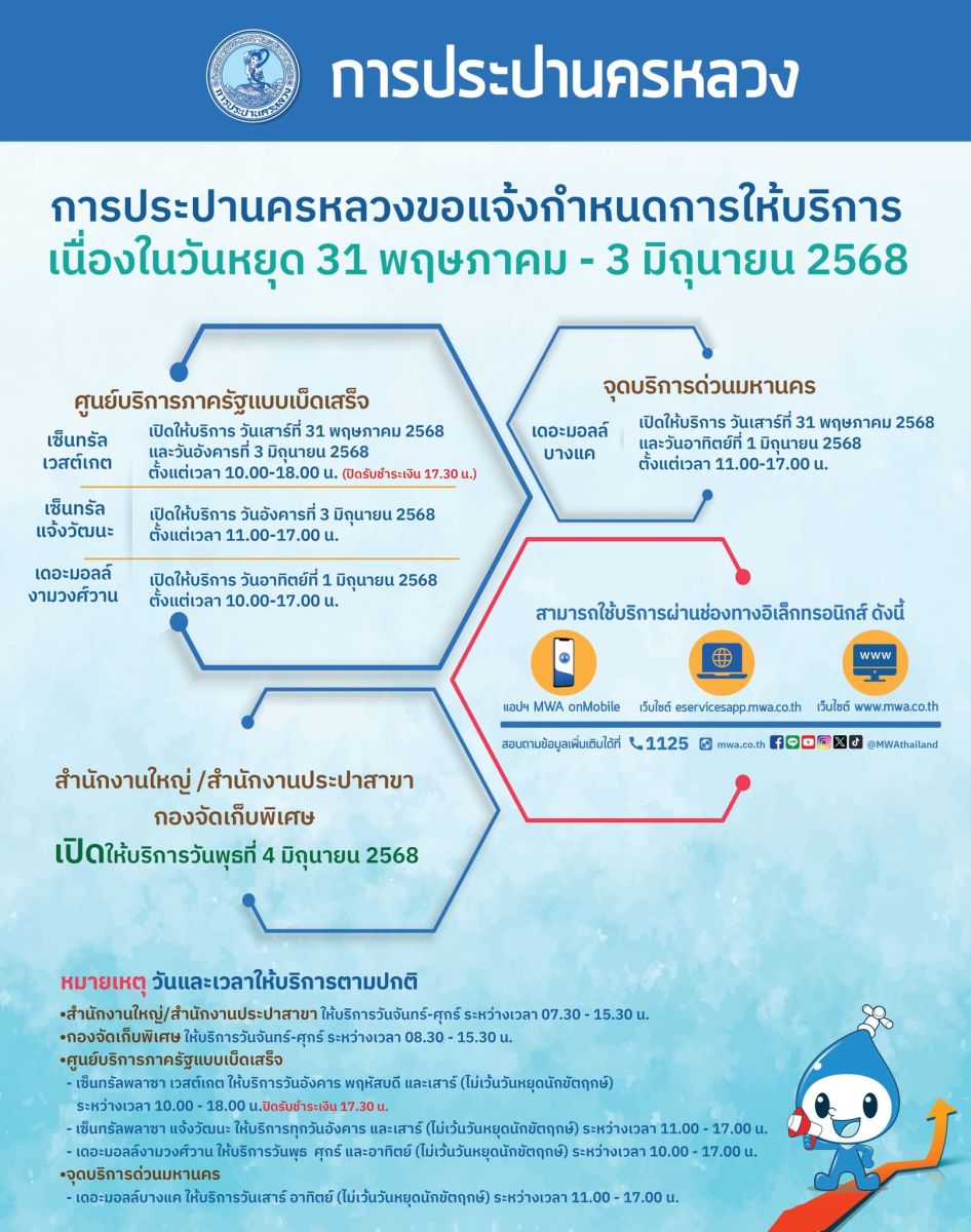 นายกิตติ ศรีพรหมมุนี ผู้อำนวยการฝ่ายสื่อสารองค์กร การประปานครหลวง (กปน.) กล่าวว่า เนื่องในช่วงวันหยุดยาว 31 พฤษภาคม – 3 มิถุนายน 2568 กปน. จะปิดที่ทำการชั่วคราว ทั้งนี้ ลูกค้าสามารถใช้บริการได้อย่างต่อเนื่องผ่านช่องทาง ดังนี้