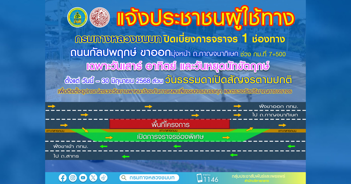 กรมทางหลวงชนบท แจ้งปิดเบี่ยงการจราจร 1 ช่องทาง บนถนนกัลปพฤกษ์และถนนราชพฤกษ์ เพื่อติดตั้งอุปกรณ์ตรวจวัดยานพาหนะป้องกันการหลบเลี่ยงของรถบรรทุก และตรวจวัดปริมาณการจราจร เฉพาะวันเสาร์ วันอาทิตย์ และวันหยุดนักขัตฤกษ์ ตั้งแต่ วันนี้ – 30 มิถุนายน 2568 ส่วนวันธรรมดาเปิดสัญจรตามปกติ เพื่ออำนวยความสะดวกในการเดินทางให้กับประชาชน