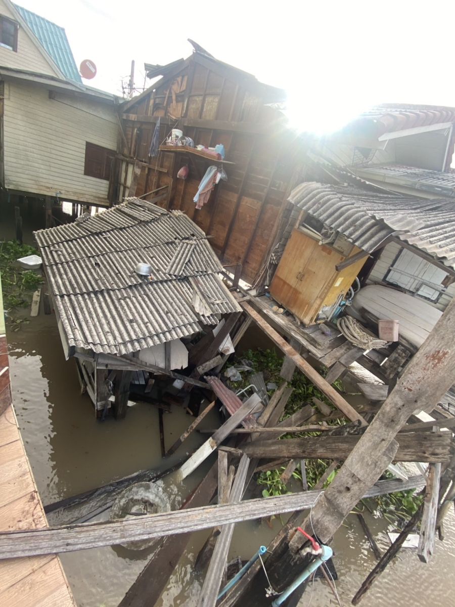 ผู้สื่อข่าวลงพื้นที่ ตรวจสอบพบว่าจุดที่ถล่มลงมาเป็นห้องที่ผู้บาดเจ็บอาศัยอยู่ มีความยาว 6 เมตร กว้าง 3 เมตร ตัวคานหลังคาด้านบนของ จั่วมีร่องรอยไม้ฉีกขาด มีเศษกองไม้ หลังคาจำนวนมากลงไปกองอยู่ในแม่น้ำ เจ้าหน้าที่ ป้องกันและบรรเทาสาระภัยเทศบาลนครนนทบุรี และนายรังสรรค์ อายุ 70 ปี พี่ชายของผู้บาดเจ็บ กำลังรื้อโครงสร้างออกเพื่อป้องกันการดึงตัวบ้านที่เหลือซ้ำ