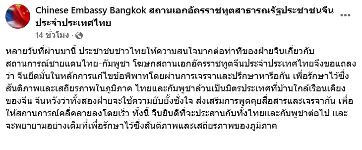 7 มิถุนายน 2568 โฆษกสถานเอกอัครราชทูตจีนประจำประเทศไทย แถลง จีนยึดมั่นในหลักการแก้ไขข้อพิพาทชายแดนไทย-กัมพูชา โดยผ่านการเจรจาและปรึกษาหารือกัน เพื่อรักษาไว้ซึ่งสันติภาพและเสถียรภาพในภูมิภาค รายละเอียดระบุว่า "หลายวันที่ผ่านมานี้ ประชาชนชาวไทยให้ความสนใจมากต่อท่าทีของฝ่ายจีนเกี่ยวกับสถานการณ์ชายแดนไทย-กัมพูชา โฆษกสถานเอกอัครราชทูตจีนประจำประเทศไทยจึงขอแถลงว่า จีนยึดมั่นในหลักการแก้ไขข้อพิพาทโดยผ่านการเจรจาและปรึกษาหารือกัน เพื่อรักษาไว้ซึ่งสันติภาพและเสถียรภาพในภูมิภาค ไทยและกัมพูชาล้วนเป็นมิตรประเทศที่บ้านใกล้เรือนเคียงของจีน จีนหวังว่าทั้งสองฝ่ายจะใช้ความยับยั้งชั่งใจ ส่งเสริมการพูดคุยสื่อสารและเจรจากัน เพื่อให้สถานการณ์คลี่คลายลงโดยเร็ว ทั้งนี้ จีนยินดีที่จะประสานกับทั้งไทยและกัมพูชาต่อไป และจะพยายามอย่างเต็มที่เพื่อรักษาไว้ซึ่งสันติภาพและเสถียรภาพของภูมิภาค"