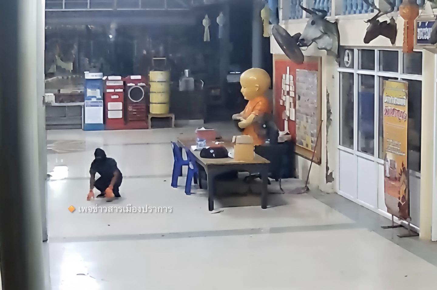 กล้องวงจรปิดจับภาพได้อย่างชัดเจน คนร้ายสวมหมวกคลุมหัวสีดำ เสื้อแขนยาว กางเกงขายาว มิดชิดราวกับเตรียมเข้าฉากในหนังนินจา เดินปรี่เข้าหาตู้บริจาคอย่างมั่นใจ ก่อนจะลงมือลากตู้บริจาคไปที่ลับตาคน ลงมืองัดกุญแจด้วยความคล่องแคล่ว