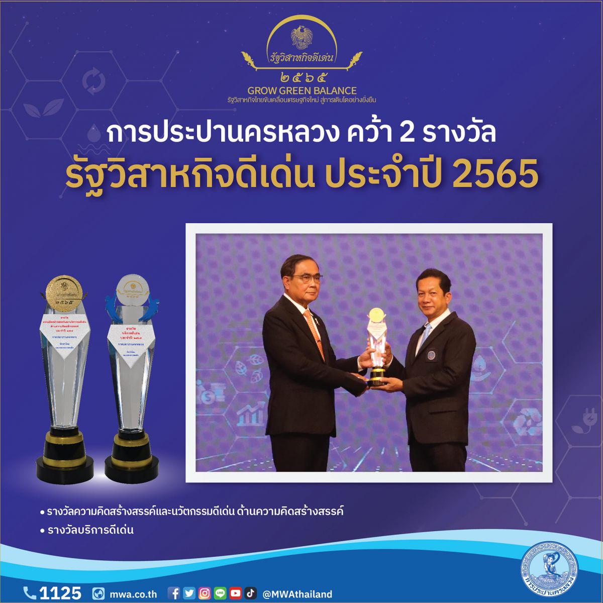 เมื่อวันที่ 24 มีนาคม พ.ศ. 2566 เวลา เวลา 09.30 น. ณ ตึกสันติไมตรี ทำเนียบรัฐบาล นายมานิต ปานเอมผู้ว่าการการประปานครหลวง (กปน.) พร้อมนายธำรง บูรณตระกูล รองผู้ว่าการ กปน. รับ 2 รางวัลรัฐวิสาหกิจดีเด่น (SOE Award) ประจำปี 2565 ได้แก่ รางวัลความคิดสร้างสรรค์และนวัตกรรมดีเด่น ด้านความคิดสร้างสรรค์ จากผลงานยานใต้น้ำไร้คนขับ (Unmanned Underwater Vehicles – UUV) “ชาญสมร” และรางวัลรางวัลบริการดีเด่น จากโครงการ “MWA Excellence Virtual Service” ซึ่งจัดโดย สำนักงานคณะกรรมการนโยบายรัฐวิสาหกิจ (สคร.) กระทรวงการคลัง ภายใต้แนวคิด "รัฐวิสาหกิจไทยขับเคลื่อนเศรษฐกิจใหม่ สู่การเติบโตอย่างยั่งยืน (Grow Green Balance)" โดยมี พลเอก ประยุทธ์ จันทร์โอชา นายกรัฐมนตรี เป็นประธานมอบรางวัล ในการนี้ นางสาวฉวีวรรณ อุทัยพิบูลย์ และนางสาวสุวรา ทวิชศรี รองผู้ว่าการ กปน. ร่วมแสดงความยินดี