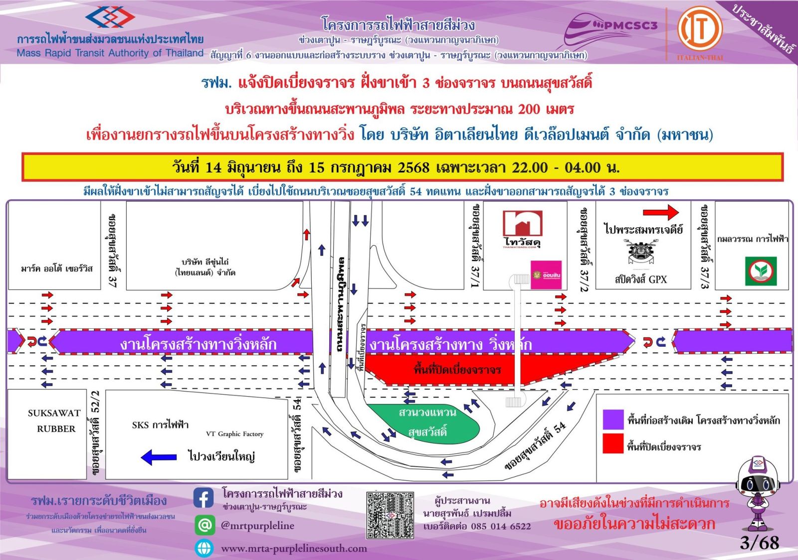 การรถไฟฟ้าขนส่งมวลชนแห่งประเทศไทย (รฟม.) แจ้งว่า บริษัท อิตาเลียนไทย ดีเวล๊อปเมนต์ จำกัด (มหาชน) ผู้รับจ้างงานออกแบบและก่อสร้างระบบรางตลอดแนวเส้นทางโครงการ โครงการรถไฟฟ้าสายสีม่วง ช่วงเตาปูน – ราษฎร์บูรณะ (วงแหวนกาญจนาภิเษก) สัญญาที่ 6 มีความจำเป็นต้องปิดเบี่ยงจราจร ฝั่งขาเข้า 3 ช่องจราจร บนถนนสุขสวัสดิ์ บริเวณทางขึ้นถนนสะพานภูมิพล ระยะทางประมาณ 200 เมตร เพื่องานยกรางรถไฟขึ้นบนโครงสร้างทางวิ่ง ระหว่างวันที่ 14 มิถุนายน – 15 กรกฎาคม 2568 เฉพาะเวลา 22.00 – 04.00 น. มีผลให้ฝั่งขาเข้าไม่สามารถสัญจรได้ โดยให้เบี่ยงไปใช้ถนนบริเวณซอยสุขสวัสดิ์ 54 ทดแทน และฝั่งขาออกสามารถสัญจรได้ 3 ช่องจราจร