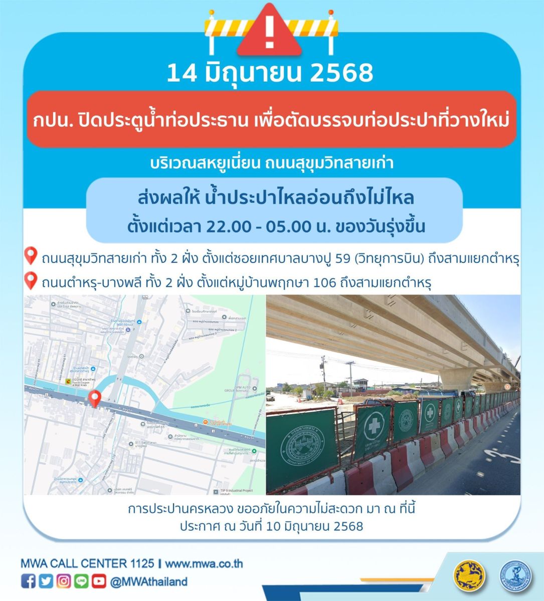 การประปานครหลวง (กปน.) มีความจำเป็นต้องปิดประตูน้ำท่อประธานขนาดเส้นผ่านศูนย์กลาง 600 มิลลิเมตร เพื่อตัดบรรจบท่อประธานเดิม เข้ากับท่อประปาที่วางใหม่ บริเวณสหยูเนี่ยน ถนนสุขุมวิทสายเก่า ในคืนวันเสาร์ที่ 14 มิถุนายน 2568 ตั้งแต่เวลา 22.00 - 05.00 น. ของวันรุ่งขึ้น เพื่อให้ประชาชนได้รับบริการน้ำประปาอย่างเพียงพอและทั่วถึง โดยระหว่างดำเนินการ ส่งผลให้ น้ำประปาไหลอ่อนถึงไม่ไหล ในพื้นที่ดังต่อไปนี้