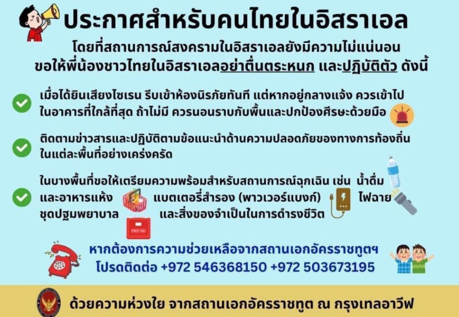 ขณะที่สถานเอกอัครราชทูตไทย ณ กรุงเทลอาวีฟ ออกประกาศสำหรับคนไทยในอิสราเอล โดยระบุว่า สถานการณ์สงครามในอิสราเอลยังมีความไม่แน่นอน ขอให้ชาวไทยในอิสราเอลอย่าตื่นตระหนก และปฏิบัติตัว ดังนี้