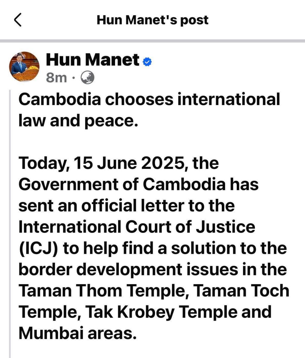 วันที่ 15 มิถุนายน 2568 ซึ่งตรงกับวันครบรอบ 63 ปีแห่งคำพิพากษาศาลยุติธรรมระหว่างประเทศ (ICJ) ที่ตัดสินให้ปราสาทพระวิหารเป็นของกัมพูชา (15 มิถุนายน 2505) สถานการณ์ความสัมพันธ์ระหว่างไทยและกัมพูชาได้กลับมาอยู่ในจุดที่ตึงเครียดอีกครั้ง เมื่อปรากฏรายงานว่า สมเด็จฯ ฮุน มาเนต นายกรัฐมนตรีกัมพูชา บุตรชายของสมเด็จฯ ฮุน เซน ได้ส่งทีมทนายความยื่นเรื่องต่อศาลโลก เพื่อขอให้พิจารณาตีความคำพิพากษาเดิมเพิ่มเติมในประเด็น 4 พื้นที่พิพาท บริเวณชายแดน