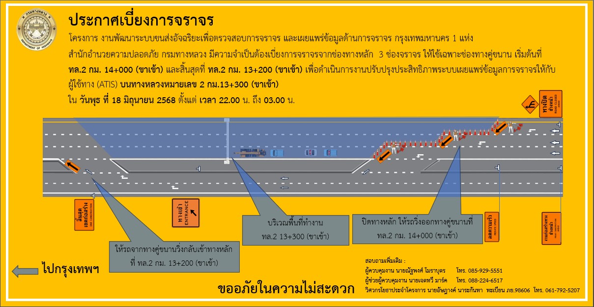 คืนวันที่ 18 มิถุนายน 2568 จะมีการ รื้อถอนโครงป้ายระบบเผยแพร่ข้อมูลการจราจรให้กับผู้ใช้ทาง (ATIS) ที่ติดตั้ง ทล.2 (ถนนมิตรภาพ) กม.13+300 ขาเข้า กทม.