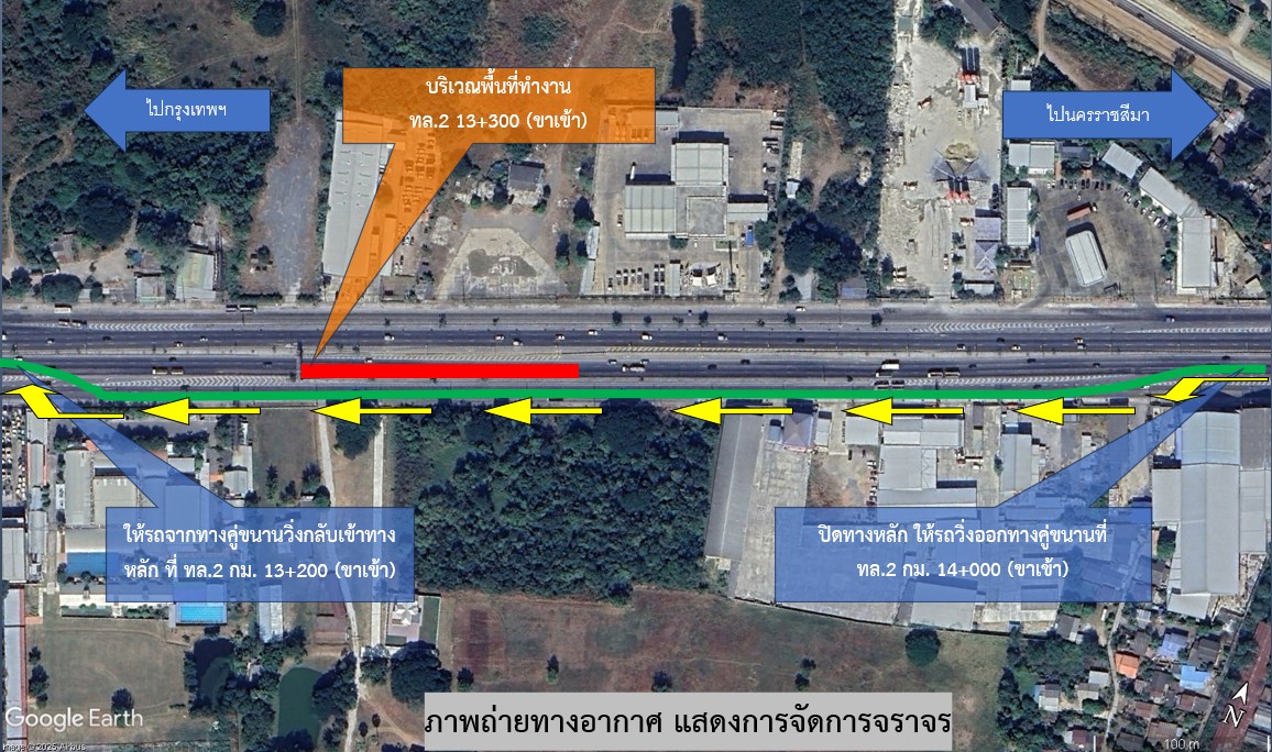ใช้ช่องทางคู่ขนาน เริ่มต้นที่ ทล.2 กม.14+000 ขาเข้า และสิ้นสุด ทล.2 กม.13+200