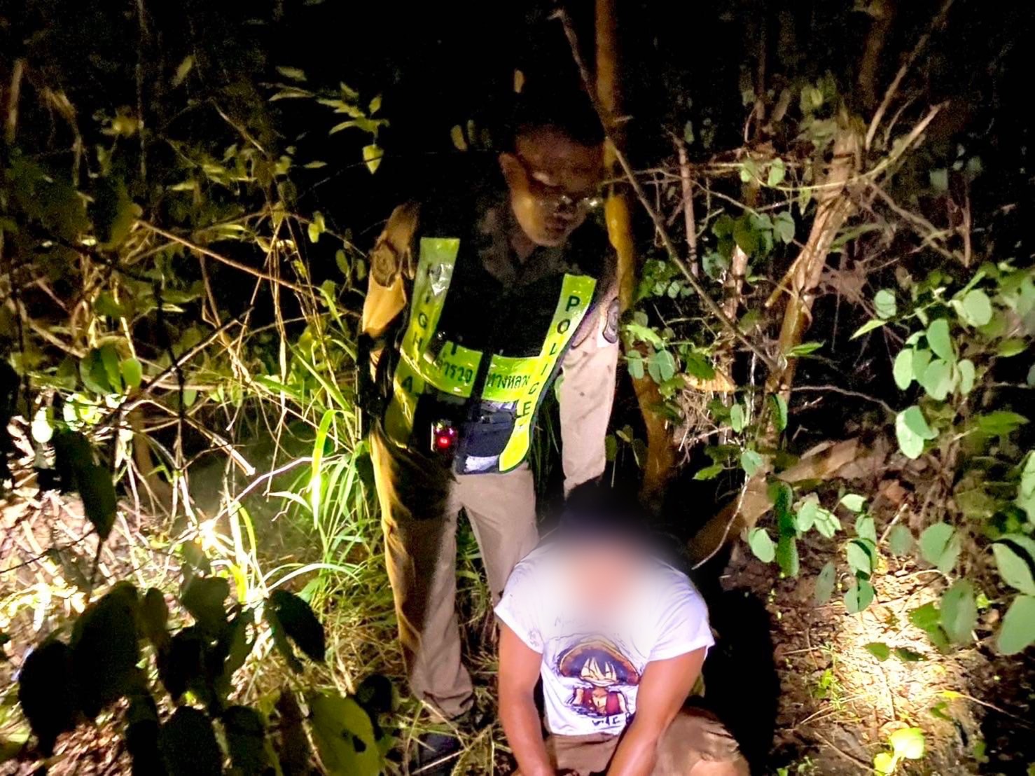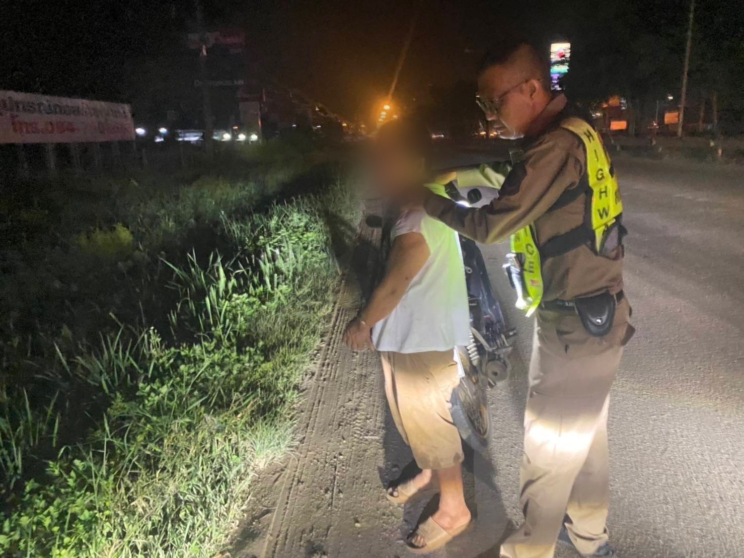 จากนั้นเจ้าหน้าที่ตำรวจได้เข้าทำการตรวจค้นตัว จนกระทั่งเมื่อค้นในกระเป๋ากางเกงด้านซ้ายของนายเอ็มก็พบถุงพลาสติกสีน้ำเงิน ด้านในบรรจุสิ่งของลักษณะเป็นเม็ดๆ เชื่อได้ว่าเป็นยาบ้า แต่ยังไม่ทันที่เจ้าหน้าที่ตำรวจจะดำเนินการอะไรเพิ่มเติม นายจัน (นามสมมุติ) อายุ 44 ปี ก็กระโจนวิ่งหนีอย่างไม่คิดชีวิต ทิ้งรถจักรยานยนต์ไว้บนถนน โดยมี ด.ต.กิตติชัยฯ ผู้บังคับหมู่สถานีตำรวจทางหลวงชุมพร วิ่งไล่ติดตามไปอย่างกระชั้นชิด ในขณะที่เจ้าหน้าที่ตำรวจทางหลวงอีกคน คือ ร.ต.อ.วิมลฯ รองสารวัตรสถานีตำรวจทางหลวงชุมพร ได้ใช้ไหวพริบ และสัญชาตญาณของเจ้าหน้าที่ตำรวจ ขึ้นคร่อมรถจักรยานยนต์ที่ นายจัน (นามสมมุติ) ทิ้งไว้ สตาร์ทรถและขับไล่ติดตามไป จนเมื่อใกล้จะถึงตัว นายจัน (นามสมมุติ) อายุ 44 ปี ได้วิ่งเข้าป่าข้างทาง ทำให้เจ้าหน้าที่ตำรวจทั้ง 2 นาย ต้องวิ่งติดตามเข้าไปในป่า จนกระทั่งสามารถรวบตัวไว้ได้