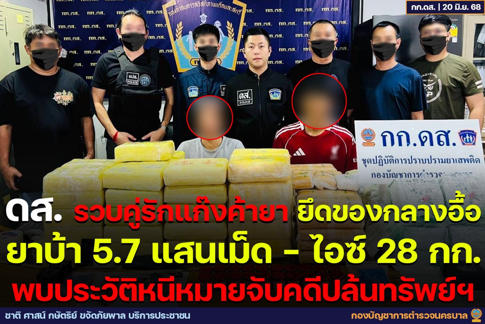รวบคู่รักแก๊งค้ายา ยึดของกลางอื้อ ยาบ้า 5.7 แสนเม็ด -ไอซ์ 28 กก. พบประวัติหนีหมายจับคดีปล้นทรัพย์ฯ