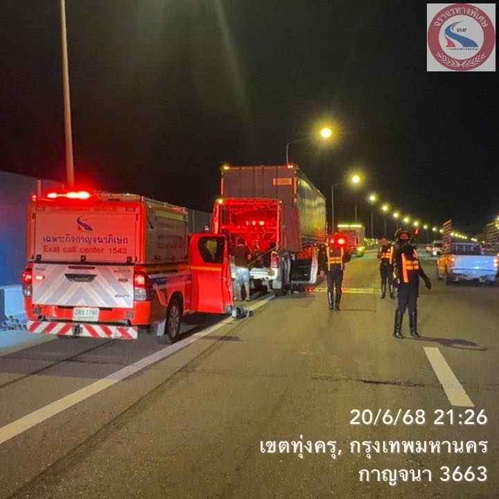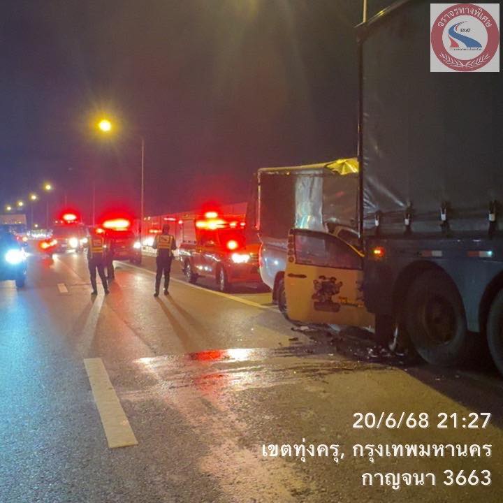 เวลา 21:20 น. วันที่ 20 มิถุนายน 2568 เพจข่าวสารงานจราจรทางพิเศษฯ รายงานมีอุบัติเหตุ บนทางด่วนกาญจนาภิิเษก กม.2+300A รถกระบะ ชนท้ายรถบรรทุก22ล้อ ขวางเลนซ้ายและไหลทางซ้าย เป็นผลให้รถการจราจร มาจากบางครุมุ่งหน้าบางขุนเทียน ติดสะสม จุดเกิดเหตุพบผู้ได้รับบาดเจ็บ 2 ราย ติดภายใน 1 คน ขอผู้ใช้ทางกำลังจะผ่านบริเวณนี้ระมัดระวัง พนักงานจัดการจราจรและพนักงานกู้ภัยการทางพิเศษฯ อยู่ระหว่างดำเนินการให้ความช่วยเหลือ
