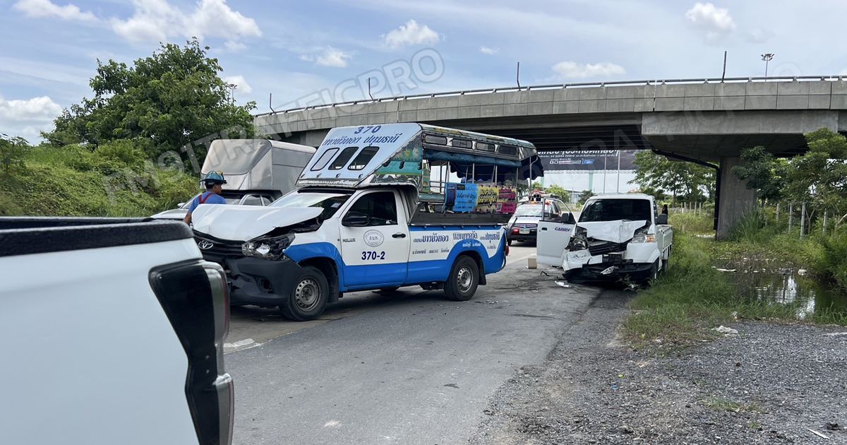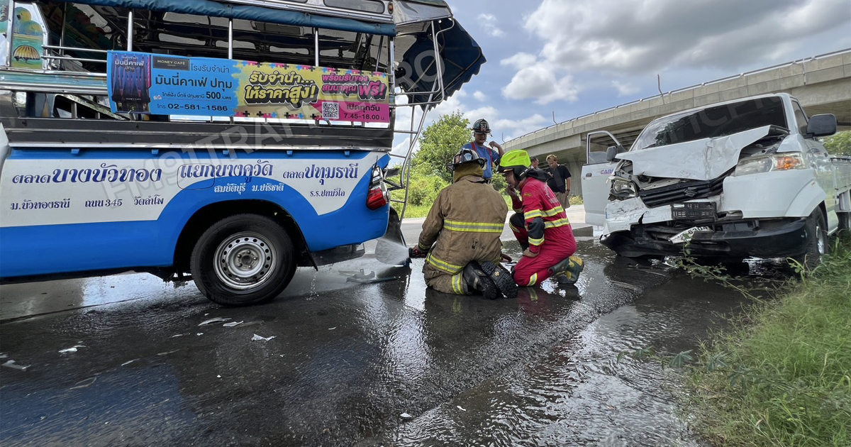 ที่เกิดเหตุพบรถโดยสารสาธารณะสองแถว สีฟ้า-ขาว ทะเบียนนนทบุรี วิ่งระหว่าง บางบัวทอง-ปทุมธานี สภาพด้านหน้าและหลังรถพังเสียหาและยมีก๊าซรั่วไหล ใกล้กันยังพบรถกระบะ อีซูซุ สีขาว ทะเบียนกรุงเทพมหานคร สภาพด้านท้ายยุบพังเสียหายเช่นกัน และยังมีรถกระบะ ยี่ห้อ ซูซูกิ แครี่ ทะเบียนพิษณุโลก ด้านหน้ายุบพังเสียหายด้านท้ายบรรทุกโครงอะลูมิเนียม