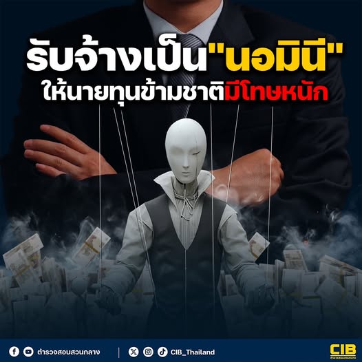 ตำรวจสอบสวนกลาง(CIB) ขอแจ้งเตือนไปยังพี่น้องประชาชนคนไทย หากมีกลุ่มนายทุนเชิญชวนให้ช่วยเหลือ ในลักษณะเป็นนอมินีต่างๆ โปรดอย่าหลงเชื่อ และอย่าเห็นแก่เงินจนลืมนึกถึงผลเสียที่จะตามมา