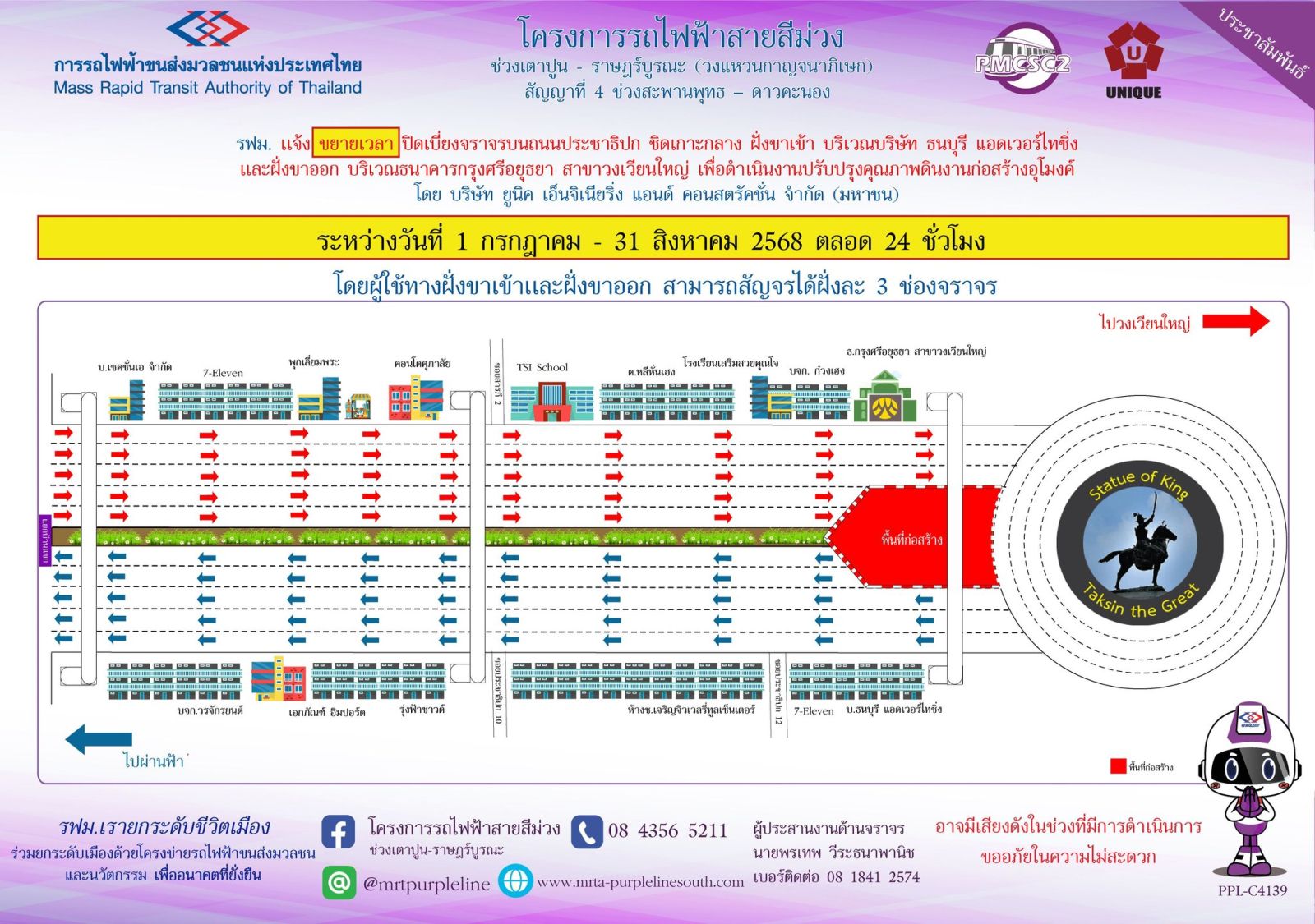การรถไฟฟ้าขนส่งมวลชนแห่งประเทศไทย (รฟม.) แจ้งว่า บริษัท ยูนิค เอ็นจิเนียริ่ง แอนด์ คอนสตรัคชั่น จำกัด (มหาชน) ผู้รับจ้างงานออกแบบและก่อสร้างอุโมงค์ทางวิ่งและสถานีใต้ดิน โครงการรถไฟฟ้าสายสีม่วง ช่วงเตาปูน - ราษฎร์บูรณะ (วงแหวนกาญจนาภิเษก) สัญญาที่ 4 ช่วงสะพานพุทธ - ดาวคะนอง มีความจำเป็นต้องปิดเบี่ยงจราจรบนถนนประชาธิปก ชิดเกาะกลาง ฝั่งขาเข้า บริเวณธนบุรี แอดเวอร์ไทซิ่ง และฝั่งขาออก บริเวณธนาคารกรุงศรีอยุธยา สาขาวงเวียนใหญ่ เพื่อดำเนินงานปรับปรุงคุณภาพดินงานก่อสร้างอุโมงค์ ระหว่างวันที่ 1 กรกฎาคม – 31 สิงหาคม 2568 ตลอด 24 ชั่วโมง โดยผู้ใช้ทางฝั่งขาเข้าและฝั่งขาออก สามารถสัญจรได้ฝั่งละ 3 ช่องจราจร