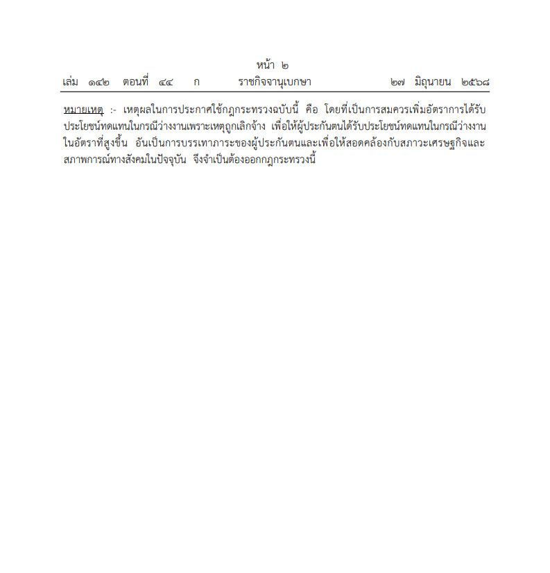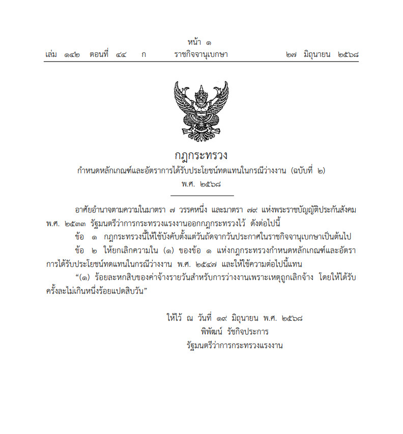 วันที่ 27 มิถุนายน 2568 เว็บไซต์ ราชกิจจานุเบกษา เผยแพร่ กฎกระทรวง กำหนดหลักเกณฑ์และอัตราการได้รับประโยชน์ทดแทนในกรณีว่างงาน (ฉบับที่ 2) พ.ศ. 2568