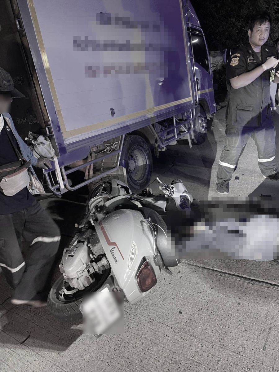 หนุ่มขี่รถจักรยานยนต์เฉี่ยวกับรถตู้ ก่อนเสียหลักชนรถบรรทุก เสียชีวิตกลางถนนทางเข้าหมู่บ้านเอื้ออาทร จ.พระนครศรีอยุธยา
