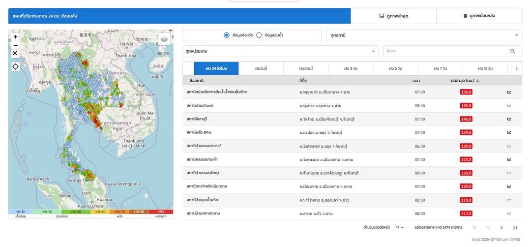 กรมป้องกันและบรรเทาสาธารณภัย (ปภ.) และจังหวัดน่าน ได้ติดตามสถานการณ์ปริมาณฝนในพื้นที่ จ.น่าน พบว่าพื้นที่ อ.ทุ่งช้าง มีฝนตกหนักและยังคงตกต่อเนื่อง ขอให้เฝ้าระวังน้ำท่วมฉับพลัน/น้ำป่าไหลหลาก/ดินโคลนถล่ม ในระหว่างวันที่ 3-4 ก.ค. 68 โดยเฉพาะบริเวณพื้นที่ ต.ทุ่งช้าง อ.ทุ่งช้าง โดยให้ประชาชนที่อาศัยอยู่ในพื้นที่ลุ่มต่ำเตรียมยกของขึ้นที่สูง ดูแลกลุ่มเปราะบาง เช่น เด็กเล็ก ผู้สูงอายุ ผู้ป่วยติดเตียง ประชาชนที่อาศัยอยู่ที่ลาดเชิงเขาให้เฝ้าระวังดินโคลนถล่ม และขอให้ติดตามข่าวสารจากทางราชการในพื้นที่อย่างใกล้ชิด