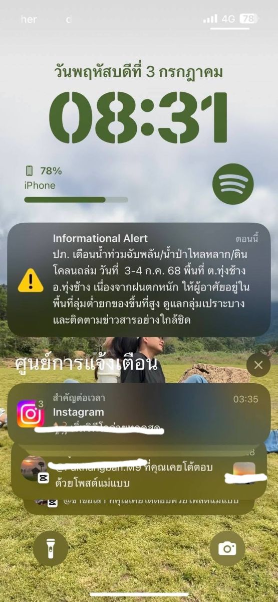ปภ. จึงได้ร่วมกับผู้ให้บริการเครือข่ายโทรศัพท์เคลื่อนที่ Ais True และ NT ส่งข้อความแจ้งเตือนผ่าน Cell Broadcast แจ้งเตือนให้เฝ้าระวังน้ำท่วมฉับพลัน/น้ำป่าไหลหลาก/ดินโคลนถล่ม บริเวณพื้นที่ ต.ทุ่งช้าง อ.ทุ่งช้าง จ.น่าน