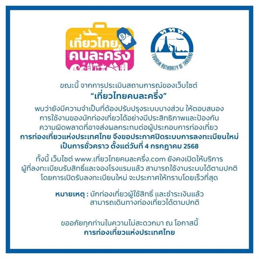 วันนี้ (4 ก.ค.68) นายสรวงศ์ เทียนทอง รัฐมนตรีว่าการกระทรวงการท่องเที่ยวและกีฬา ให้สัมภาษณ์รายการเจาะลึกทั่วไทย Inside Thailand เกี่ยวกับปัญหาที่เกิดขึ้น ในการลงทะเบียนขอรับสิทธิในโครงการเที่ยวไทยคนละครึ่ง ว่า ได้รับการร้องเรียนจำนวนมากเกี่ยวกับปัญหาการลงทะเบียน สิ่งที่เกิดขึ้น คือ ที่ทำมาทั้ง 5 เฟส การท่องเที่ยวแห่งประเทศไทย หรือ ททท. ไม่มีฐานข้อมูลของนักท่องเที่ยวหรือลูกค้าในมือเลย โครงการอื่นๆที่ผ่านมา ใช้ผ่านแอพพ์ที่ดูแลโดยกรุงไทย นี่คือเหตุผลใหม่ ที่ ททท. ทำแอปใหม่ขึ้นมาเพื่อที่ต้องการจะมีฐานข้อมูลนักท่องเที่ยวคนไทยในมือเพื่อจะทำโครงการต่อๆ ไปข้างหน้า