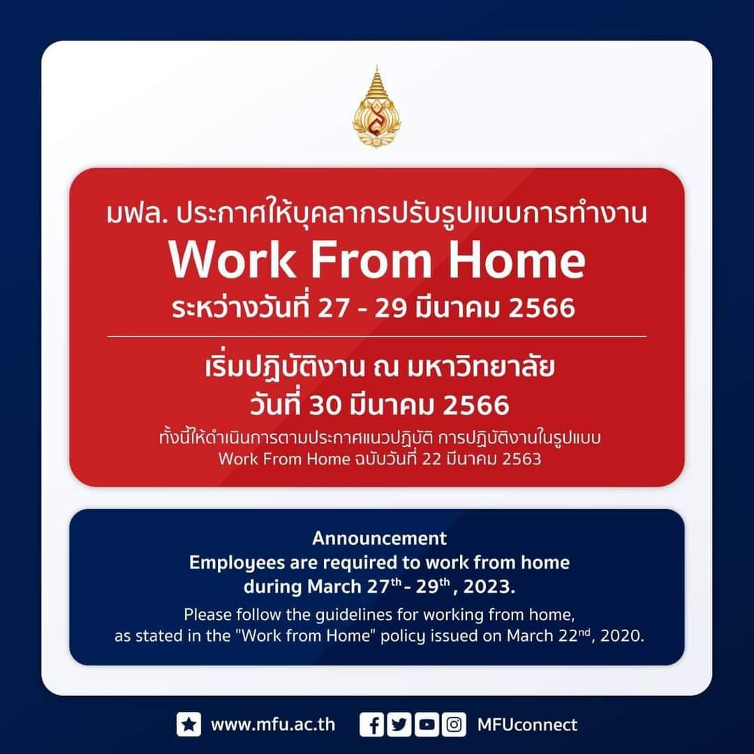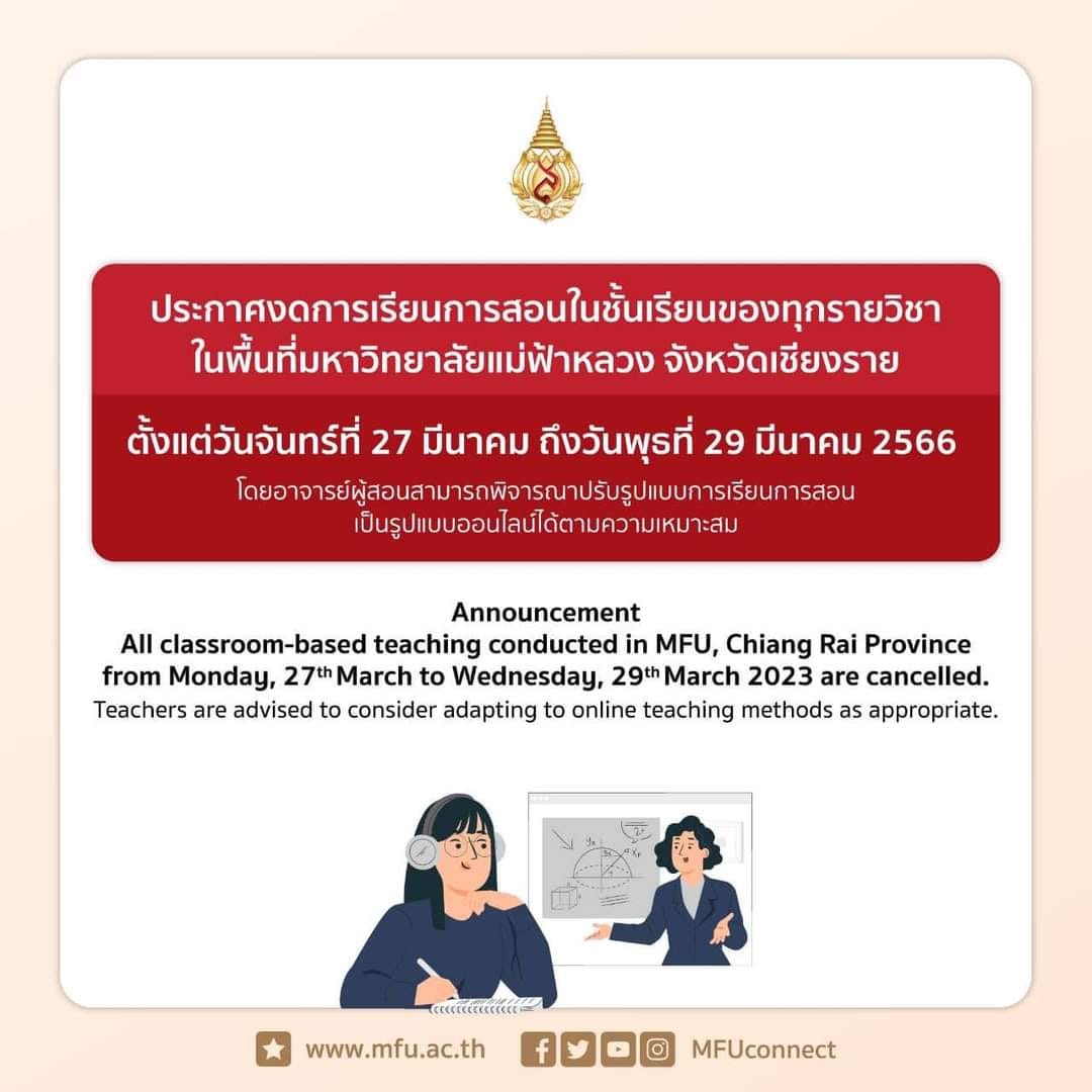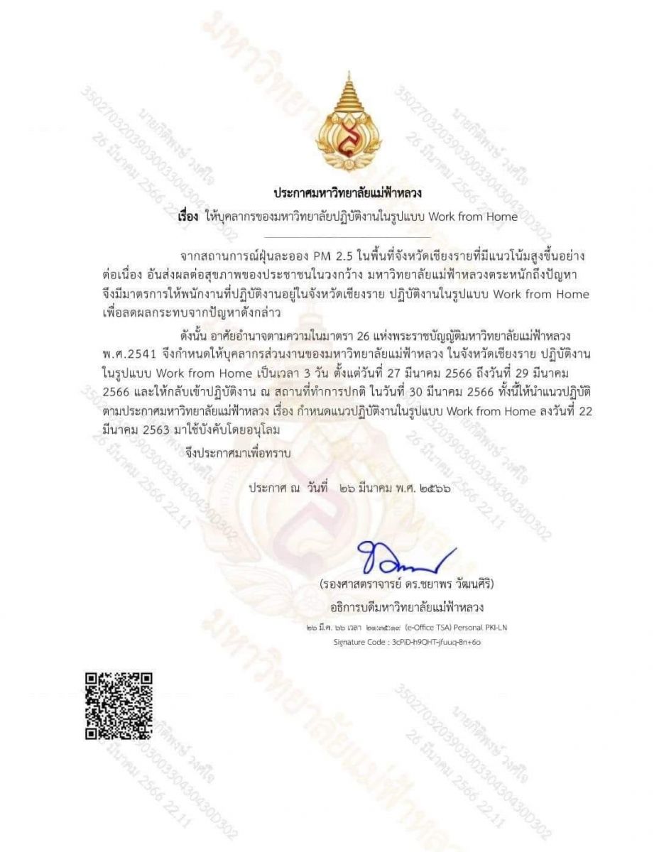 รศ.ดร.ชยาพร วัฒนศิริ อธิการบดีมหาวิทยาลัยแม่ฟ้าหลวง เชียงราย ได้ลงนามในประกาศของมหาวิทยาลัยฯ เรื่อง ให้อาจารย์ผู้สอนพิจารณาปรับรูปแบบการเรียนการสอนเป็นรูปแบบออนไลน์ และ ให้บุคลากรของมหาวิทยาลัยปฎิบัติงานในรูปแบบ Work from Home อันสืบเนื่องมาจากสถานการณ์ฝุ่นละออง PM 2.5 ในพื้นที่เชียงรายสูงขึ้นต่อเนื่อง และขอให้งดกิจกรรมในพื้นที่โล่งแจ้ง พื้นที่สุ่มเสี่ยงต่อฝุ่นควัน จึงมีประกาศให้มีการปฏิบัติงานในรูปแบบ Work From Home ในระหว่างวันจันทร์ที่ 27 ถึง วันพุธที่ 29 มีนาคม 2566 รวม 3 วัน