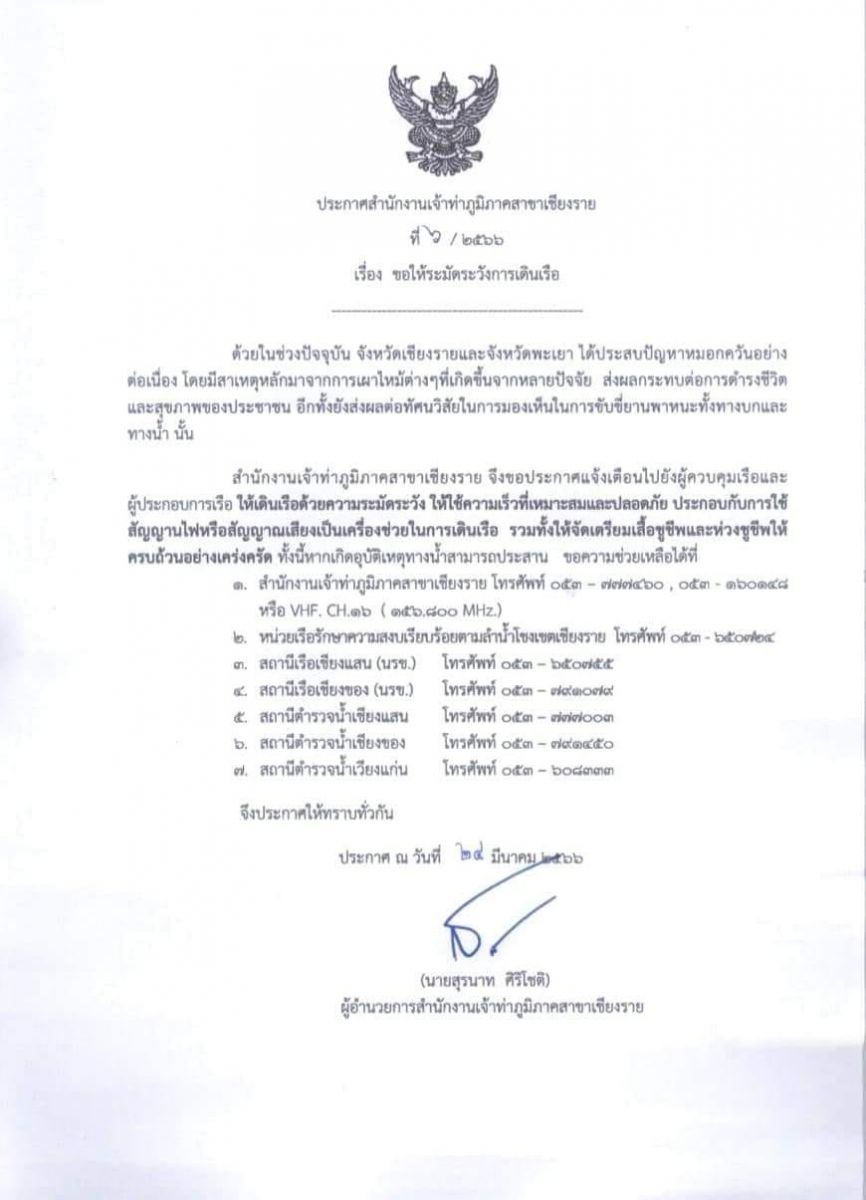 สำนักงานเจ้าท่าภูมิภาคสาขาเชียงรายออกประกาศ แจ้งเตือนไปยังผู้ควบคุมเรือและผู้ประกอบการเรือ จังหวัดเชียงรายและจังหวัดพะเยา ให้เดินเรือด้วยความระมัดระวัง ใช้ความเร็วที่เหมาะสมและปลอดภัย ประกอบกับการใช้สัญญานไฟหรือสัญญาณเสียงเป็นเครื่องช่วยในการเดินเรือ รวมทั้งให้จัดเตรียมเสื้อชูชีพและห่วงชูชีพให้ ครบถ้วนอย่างเคร่งครัด เนื่องจากสถานการณ์หมอกควันอย่างต่อเนื่อง