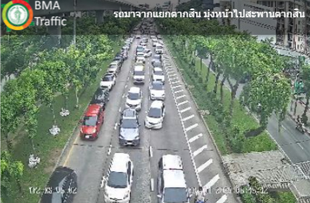 - สะพานสมเด็จพระเจ้าตากสิน ขาเข้า ท้ายแถวสะสมอยู่ที่ใต้บีทีเอสวงเวียนใหญ่