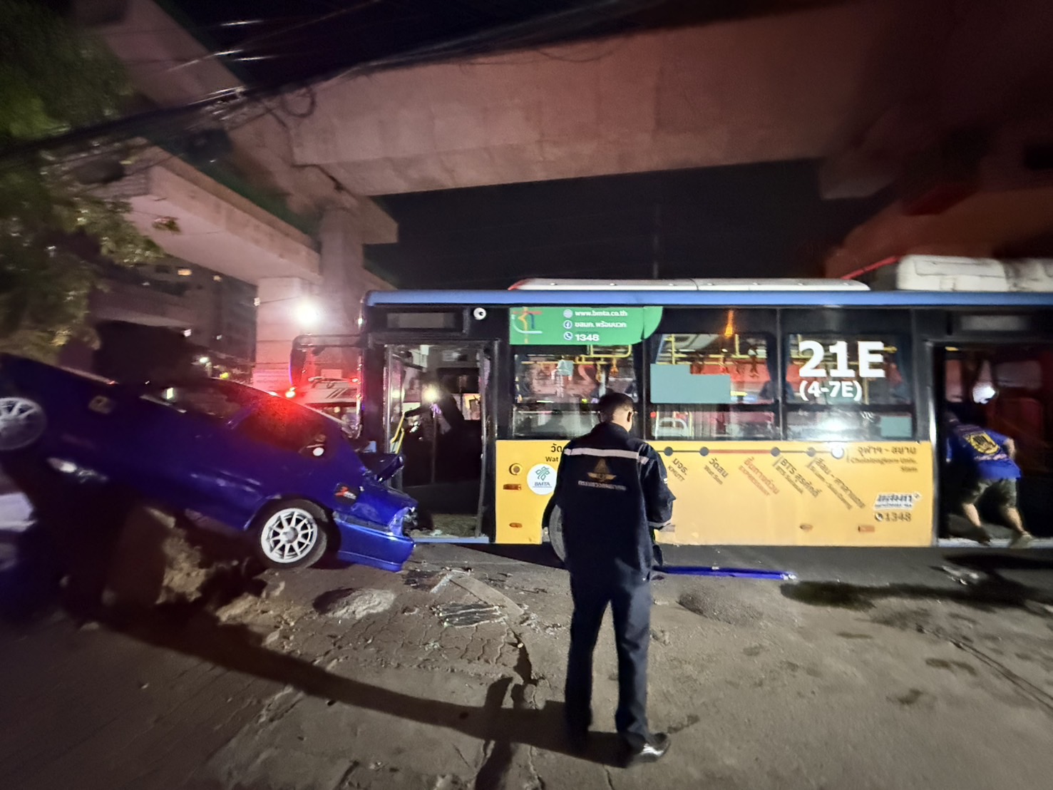 รถบรรทุกชนท้ายรถประจำทางสาย 21E กระเด็นไปโดนรถเก๋ง แล้วเสยต้นไม้ข้างทาง และรถจยย. มีผู้บาดเจ็บหลายราย และรถติดอย่างหนัก ผ่านได้เลนขวา