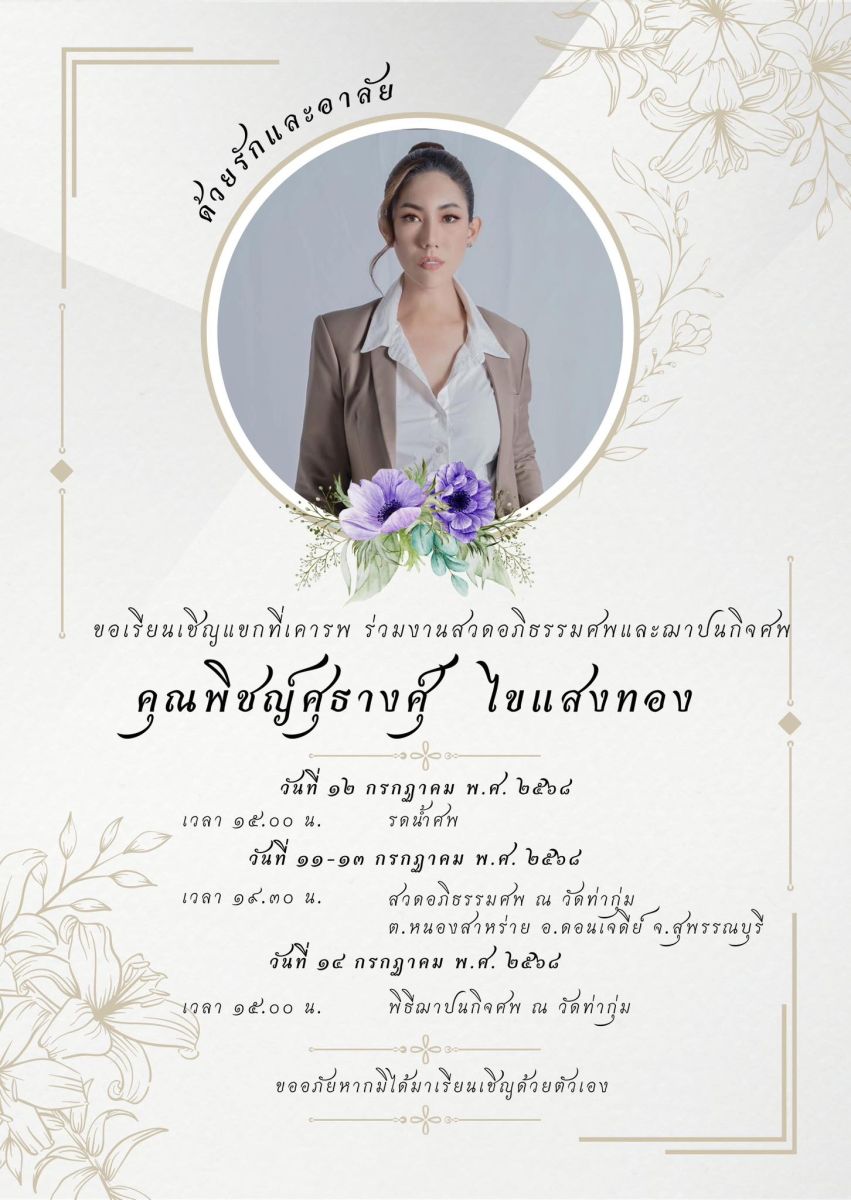 พิธีรดน้ำศพ: วันเสาร์ที่ 12 กรกฎาคม 2568 เวลา 15.00 น. ณ ศาลาการเปรียญ วัดท่ากุ่ม ต.หนองสาหร่าย อ.ดอนเจดีย์ จ.สุพรรณบุรี