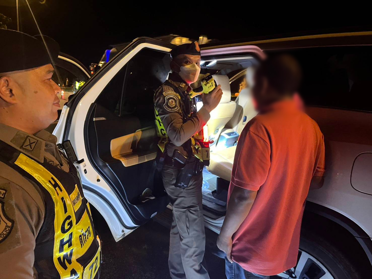 ประกอบกับมีกลิ่นสุราในขณะที่พูดคุยกัน ต่อมาได้ตรวจค้นบริเวณตรงช่องเก็บของด้านหลังของที่นั่งผู้โดยสารข้างผู้ขับขี่ พบอาวุธปืนซองบรรจุกระสุน และซองพกในแบบหนังสีดำ จึงได้ตรวจยึดไว้ จากการสอบถามนายพัน (นามสมมุติ) อ้างว่าตนได้ไปดื่มสุราในงานฉลองวันเกิดญาติมาก่อนที่มาถึงจุดตรวจ เจ้าหน้าที่ตำรวจจึงได้ตรวจปริมาณแอลกอฮอล์ด้วยเครื่องตรวจ ปรากฏว่ามีระดับแอลกอฮอล์ 148 มิลลิกรัมเปอร์เซ็นต์ ซึ่งเกินกว่าที่กฎหมายกำหนด จึงได้นำตัวผู้ต้องหาพร้อมของกลางทั้งหมดส่งพนักงานสอบสวน สภ.เขาชัยสน เพื่อดำเนินคดีตามกฎหมายต่อไป เบื้องต้นผู้ต้องหา ให้การรับสารภาพ
