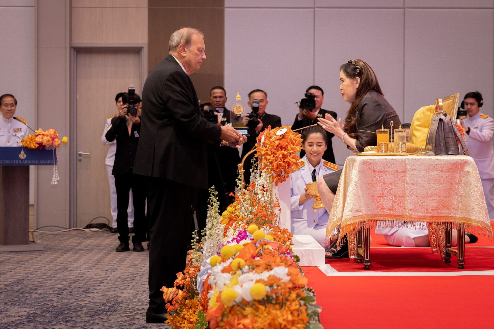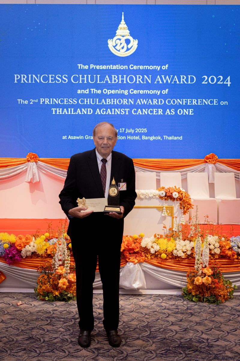 สำหรับ ศาสตราจารย์ ดร. นายแพทย์เดนนิส เจ. สเลมอน (Dennis J. Slamon, MD) ผู้ได้รับพระราชทานรางวัลสมเด็จเจ้าฟ้าจุฬาภรณ์ ประจำปี ๒๕๖๗ ซึ่งนับเป็นท่านที่สองตั้งแต่มีการจัดตั้งมูลนิธิรางวัลสมเด็จเจ้าฟ้าจุฬาภรณ์ ฯ ขึ้นมา ท่านเป็นอายุรแพทย์โรคมะเร็งชาวอเมริกัน ซึ่งมีผลงานด้านมะเร็งวิทยาเป็นที่ประจักษ์ โดยท่านเป็นผู้ค้นพบยีน Human Epidermal Growth Factor Receptor 2 (HER2) ซึ่งนำไปสู่การพัฒนายาชีววัตถุ ทราสทูซูแมบ (Trastuzumab) ซึ่งเป็นยารักษาแบบโมเลกุลมุ่งเป้าที่ปฏิวัติวงการรักษาโรคมะเร็ง โดยเฉพาะมะเร็งเต้านมชนิด HER2-positive ทำให้ช่วยชีวิตผู้หญิงนับล้านคนทั่วโลก การค้นพบของท่านนับว่าเป็นจุดเปลี่ยนของแนวทางการรักษาโรคมะเร็ง และเป็นจุดเริ่มต้นของยุคการแพทย์แบบเฉพาะบุคคล และ การแพทย์แม่นยำ ปัจจุบัน ในวัย ๗๗ ปี ศาสตราจารย์ ดร. นายแพทย์เดนนิส เจ. สเลมอน ดำรงตำแหน่งผู้อำนวยการฝ่ายวิจัยทางคลินิกและการถ่ายทอดจากห้องปฏิบัติการ ตลอดจนเป็นผู้อำนวยการโครงการวิจัยมะเร็งสตรี Revlon/UCLA ที่ศูนย์มะเร็ง Jonsson Comprehensive Cancer Center รวมถึงดำรงตำแหน่งศาสตราจารย์ด้านอายุรศาสตร์ หัวหน้าภาควิชาโลหิตวิทยา/มะเร็งวิทยา และรองคณบดีฝ่ายวิจัยของคณะแพทยศาสตร์ ณ มหาวิทยาลัยแห่งรัฐแคลิฟอเนียร์ เมืองลอสแองเจลิส ประเทศสหรัฐอเมริกา (The University of California, Los Angeles, USA)นอกจากนี้ ยังเป็นผู้อำนวยการคณะกรรมการที่ปรึกษาทางการแพทย์ของ National Colorectal Cancer Research Alliance โดยท่านยังคงทำการวิจัยอย่างต่อเนื่อง เพื่อพัฒนาประสิทธิภาพของยาและค้นหาตัวยาใหม่เพื่อรักษามะเร็งชนิดอื่น ๆ ด้วย ศาสตราจารย์ ดร. นายแพทย์ เดนนิส เจ. สเลมอน นับเป็นผู้บุกเบิกการรักษามะเร็งโดยใช้ชีววัตถุ การค้นพบยา Trastuzumab เป็นประโยชน์อย่างยิ่งต่อผู้ป่วยมะเร็งเต้านมชนิด HER2-positive นับถึงปัจจุบัน ผู้ป่วยมะเร็งนับล้านคนทั่วโลกได้รับประโยชน์และรอดชีวิตจากการรักษาด้วยยาที่ท่านค้นพบ นับว่าท่านได้ทำคุณประโยชน์อย่างยิ่งต่อมวลมนุษยชาติ