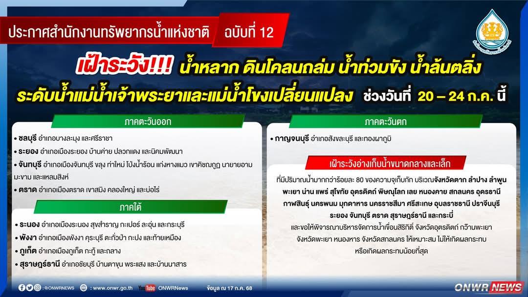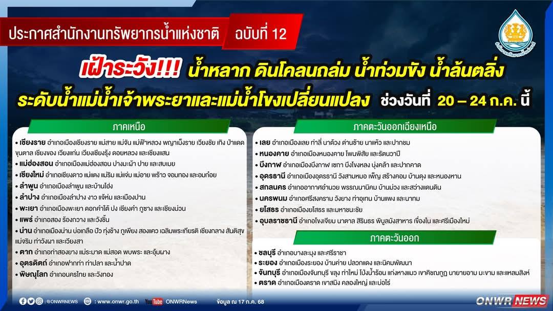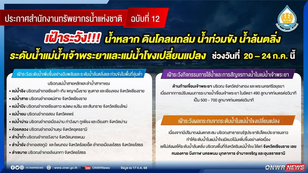 ประกาศ สำนักงานทรัพยากรน้ำแห่งชาติ ฉบับที่ 12/2568 เรื่อง เฝ้าระวังน้ำหลาก ดินโคลนถล่ม น้ำท่วมขัง น้ำล้นตลิ่ง ระดับน้ำแม่น้ำเจ้าพระยาและแม่น้ำโขงเปลี่ยนแปลง