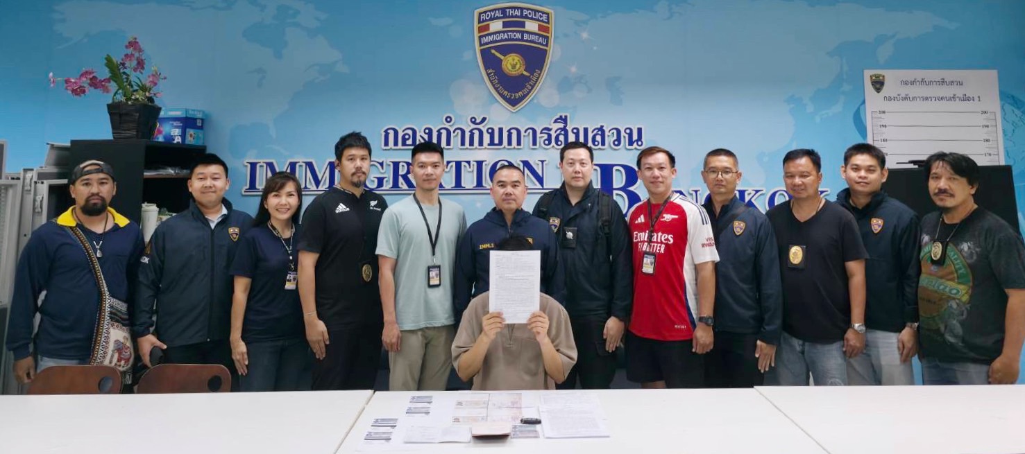 วันที่ 17 กรกฎาคม2568 พล.ต.ต.ประสาธน์ เขมะประสิทธิ์ ผู้บังคับการตรวจคนเข้าเมือง 1 พร้อมด้วย พ.ต.อ.ระพีพัฒน์ อุตสาหะ รองผู้บังคับการฯ รับผิดชอบงานตรวจคนเข้าเมืองในพื้นที่กรุงเทพมหานคร ร่วมกันแถลงผลปฏิบัติการจับกุมคนร้ายสำคัญ ซึ่งหลังจากที่ก่อนหน้านี้ ได้รับข้อมูลว่ามีบุคคลต่างด้าวสัญชาติจีน ลักลอบหนีหมายจับจากประเทศจีน เข้ามากบดานในไทย และรับทำบัตรประชาชนปลอม หรือหนังสือเดินทางปลอม ให้กับคนจีนที่อยู่ในประเทศไทย